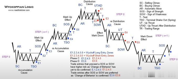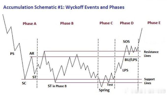 威科夫理论(Wyckoff Logic)第一张图:威科夫市场周期概览 (Wyckoff Market Cycle)这张图是整个威科夫理论的基石,它将复杂的市场行为简化为四个可识别的阶段:吸筹 (Accumulation): 价格在下跌趋势的末端进入一个横盘整理区间。这是“聪明钱”(Composite Man,即大户、机构投资者)开始悄悄买入的阶段。加价 (Markup): 当吸筹完成后,大部分流通股已被“聪明钱”控制,他们开始推动价格上涨,开启一轮新的牛市。派发 (Distribution): 在上涨趋势的顶部,价格再次进入横盘整理区间。这时,“聪明钱”开始将之前低价买入的筹码,高价卖给追涨的公众投资者。减价 (Markdown): 当派发完成后,“聪明钱”已经离场,市场失去支撑,价格开始下跌,进入熊市。专业解读:威科夫理论的核心思想是**“因果关系”。吸筹和派发是“因”,它们是为未来趋势做准备的能量积累过程。加价和减价**则是“果”,是“因”所导致的必然价格运动。理解这个周期,交易者就能判断市场当前所处的阶段,并预测未来的趋势方向。第二张图:A阶段 - 停止趋势 (Phase A: Stopping the Trend)这张图详细描绘了下跌趋势是如何被中止的,这是吸筹区间的开始。PS (初步支撑, Preliminary Support): 在长期下跌后,首次出现有意义的买盘介入,成交量放大,下跌速度开始减缓。这预示着“聪明钱”可能开始感兴趣了。SC (抛售高潮, Selling Climax): 市场出现恐慌性抛售,价格急剧下跌,成交量达到顶峰。这是公众投资者因恐惧而投降的时刻,而“聪明钱”则在此时大量买入,吸收这些恐慌性卖盘。AR (自动反弹, Automatic Rally): 随着抛售力量的枯竭和“聪明钱”的强力买入,价格自然地、猛烈地向上反弹。这次反弹的高点,往往会成为未来吸筹区间的上轨(阻力位)。ST (二次测试, Secondary Test): 价格从自动反弹的高点回落,再次测试抛售高潮的低点区域。关键点在于,这次测试的成交量应该明显小于抛售高潮时的成交量。这证明了卖压已经大大减弱,市场不再有强烈的下跌意愿。专业解读:A阶段的根本目的是**“刹车”**。它通过吸收巨大的卖压,成功地阻止了熊市的延续。二次测试(ST)的成功,是市场由“下跌”转为“横盘”的第一个确认信号。第三张图:B阶段 - 建立“因” (Phase B: Building the Cause)这张图展示了市场在A阶段确立的交易区间(Trading Range, TR)内反复震荡的过程。区间定义: B阶段的价格运动基本上被A阶段形成的**自动反弹高点(阻力)和抛售高潮低点(支撑)**所限制。主要活动: 图中文字明确指出:“在B阶段,‘聪明钱’会吸纳最大量的股票。他们在低价买入,为下一轮加价做准备。”专业解读:B阶段是整个吸筹过程中历时最长、也最核心的阶段。在此期间,“聪明钱”会通过在区间内来回制造波动,消磨散户的耐心,诱导他们交出筹码。这个阶段的成交量通常不会太大,因为“聪明钱”的目标是悄悄地、持续地买入,而不是过早地推高价格。这个“因”建立得越长、越稳固,未来“果”(加价)的行情就可能越可观。第四张图:C阶段 - 最终测试 (Phase C: The Test)这张图展示了吸筹完成前最关键、也是最具欺骗性的一步。弹簧/震仓 (Spring / Shakeout): 价格突然短暂地跌破B阶段建立的支撑线。目的: 图中文字解释道:“这样做是为了误导不知情的交易者并买走他们的股票。”专业解读:C阶段的**“弹簧”是“聪明钱”发起的最后一次“清洗”**。它有两个主要目的:最后一次测试供应: 如果价格跌破支撑后,没有引发大量的跟随性卖盘(即成交量不大),并能迅速收回支撑位之上,就证明市场上的浮动筹码(卖压)已经基本被清除干净。制造恐慌陷阱: 跌破关键支撑位的走势会触发技术派的止损盘,并诱使看空的交易者入场做空。“聪明钱”正好可以借此机会,以更低的价格买入最后一部分筹码。一个成功的“弹簧”(Spring)是极度看涨的信号,它标志着吸筹过程已进入尾声,市场“轻舟已过万重山”,随时准备开启**D阶段(突破)和E阶段(加价)**的上涨行情。对于威科夫交易者来说,这通常是风险最低、回报潜力最高的入场点。
