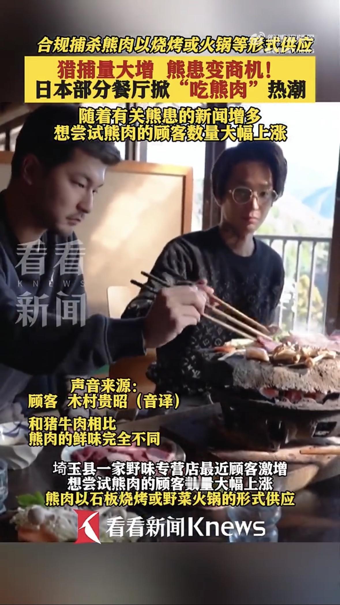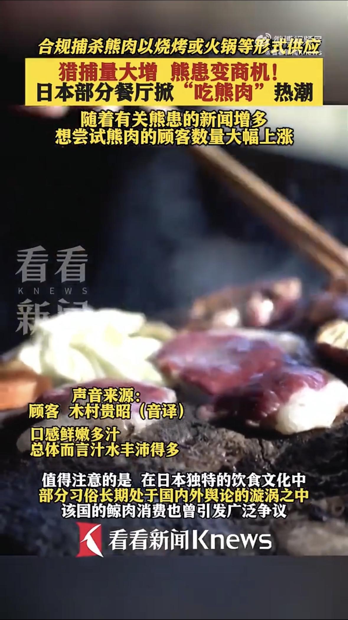最近日本多地熊咬死人,政府不得不捕杀管控,没想到这些熊转身就上了餐桌,还成了热门菜。 埼玉县有家野味店突然爆满。老板说,新闻里熊患越多,跑来尝鲜的人就越踊跃。熊肉是管控捕杀来的,放在石板上烤,或者扔进野菜锅里煮。札幌一家法式餐厅更讲究,把熊肉煎得像牛排,部位韧的就用红酒慢炖,再淋上酱汁。 今年熊灾已经带走13条人命,人命关天,捕杀也是无奈之举。可转眼间熊肉成“特色”,心里总觉得有点不是滋味。生物泛滥需要控制,但把它变成消费热点,感觉就变了味。 日本饮食文化里,这类争议一直不断,从前吃鲸鱼,现在推熊肉。我的态度很明确:生存需要可以有底线地利用资源,但不必把什么都变成舌尖上的热闹。对待生命,少点猎奇,多点敬畏。这背后不仅是吃不吃的问题,更是一种对自然的态度。