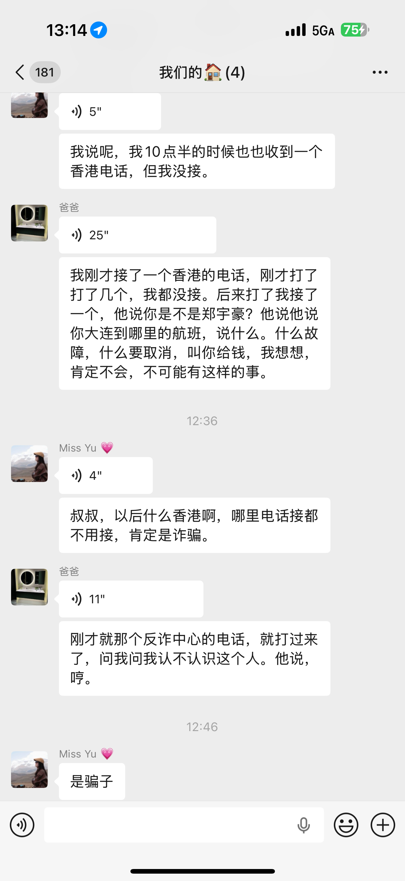 给大家分享一个聊天记录,是因为快过年了,骗子要冲KPI吗,航班取消的诈骗我早已见怪不怪,骗子没次打过来,我要么直接挂断,要么和它唠几句,把他唠的恼羞成怒,然后把我挂了然后现在骗子发现在我这行不通,打电话给我爸了,和我爸说我航班取消了,要操作改签,还好我给我老爸做了非常好的反诈科普,不然就中招了但是想想也挺可怕的,通过一张机票信息能摸到我老爸那边去ps.我在拍摄开车,然后让芋圆回的消息