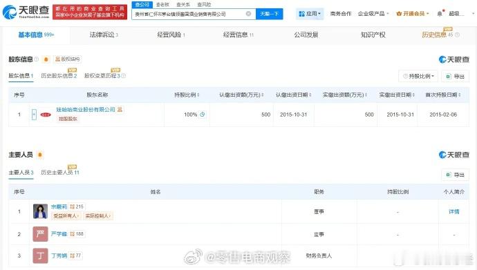 【宗馥莉实控领酱国酒业销售公司注销娃哈哈旗下领酱国酒业销售公司注销】天眼查工商信息显示,近日,贵州省仁怀市茅台镇领酱国酒业销售有限公司登记状态由存续变更为注销。该公司成立于2013年10月,法定代表人为祝丽丹,注册资本500万人民币,由娃哈哈商业股份有限公司全资持股。最终受益人信息显示,宗馥莉为该公司实际控制人。