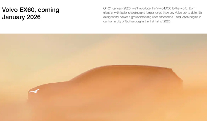 沃尔沃官方确认,全新纯电SUV EX60将于1月21日正式发布,新车基于专属SP