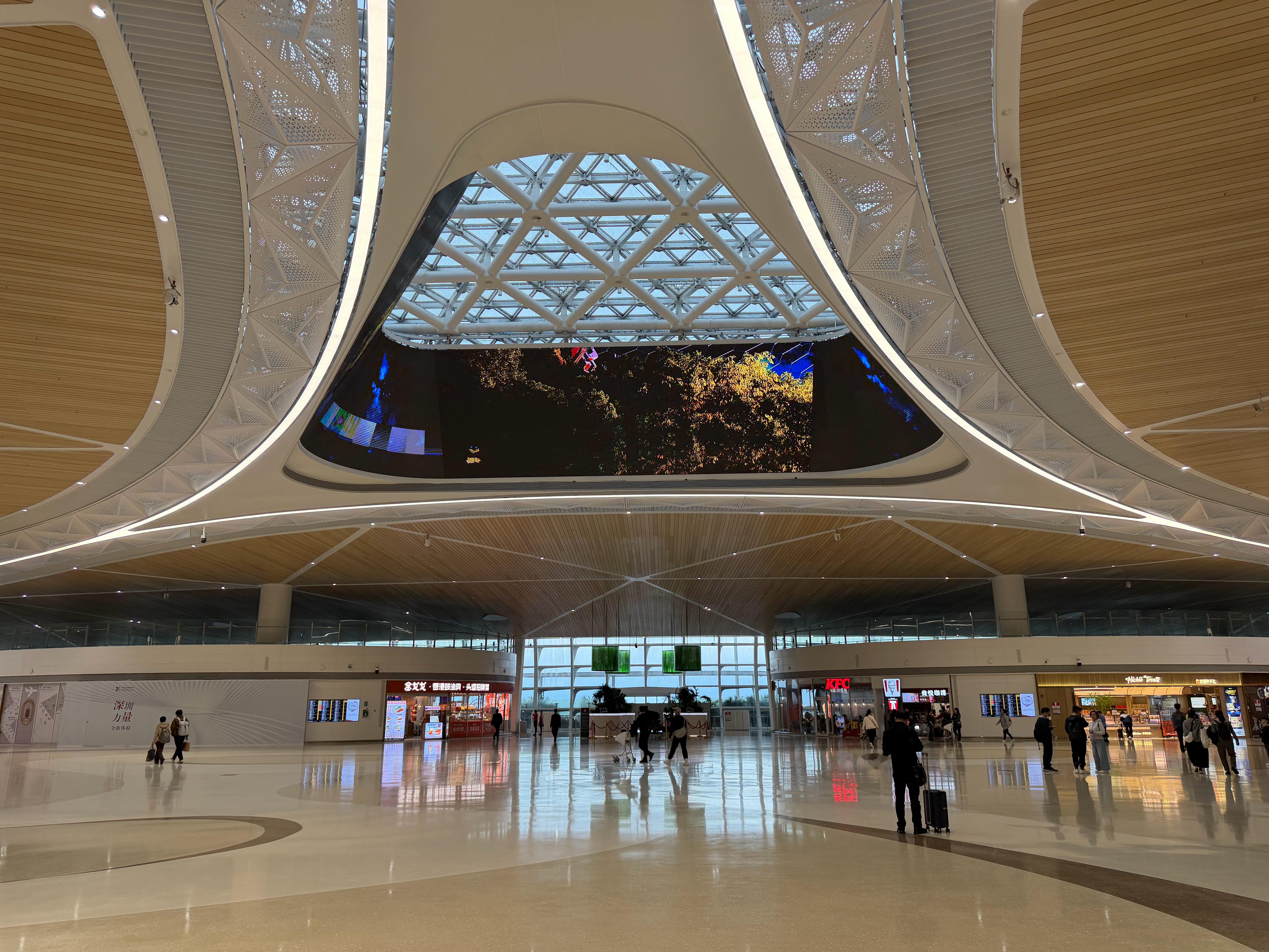 深圳宝安机场的天花板,是蜂巢设计,会让密集恐惧症的朋友受不了,但是图3 是机场的卫星厅,天花板设计更具未来科技感 深圳·深圳宝安国际机场卫星厅