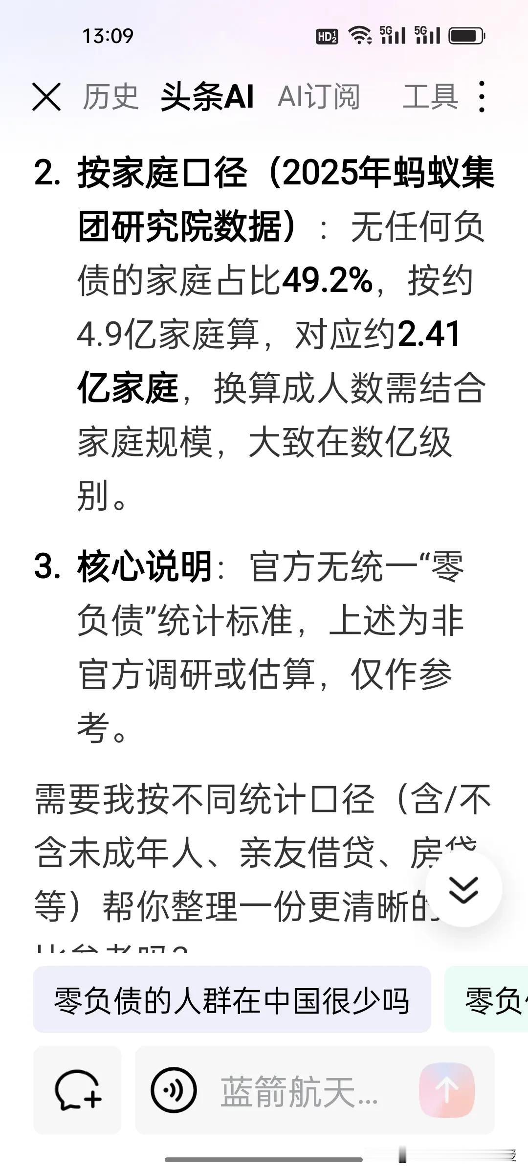 中国有多少人没有负债?刚刚看到最近有个新词叫“零负债人群”,问了一下头条AI,按照蚂蚁集团研究院的数据,零负债的成年人有1.41亿,按家庭算,大概2.41亿户,无负债家庭占比49.2%。 另外,有其他统计口径数据显示,全国42%家庭靠借贷周转,超半数负债家庭背负房贷,4.82亿人被房贷绑定,80后、90后成负债主力。 现在年轻人之间有种说法,不比为社会创造多少价值,不比工资赚多少,而是比谁没有负债。 现在各大厂都有借贷业务,没有用过京东白条,花呗,借呗,360借条,度小满的大概只能是60后了吧?