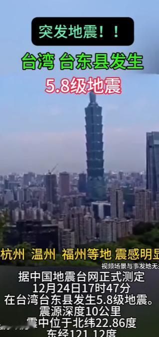 台湾台东县5.8级地震 中国地震台网正式测定:12月24日17时47分在台湾台东县(北纬22.86度,东经121.12度)发生5.8级地震,震源深度10千米。 12月24日下午5点47分,不少台湾同胞正忙着准备平安夜的晚餐,一阵突如其来的剧烈摇晃把大家吓出了一身冷汗——台湾台东县发生了5.8级地震,震源深度只有10公里,这种浅源地震的威力可不小,能量直接往地面传递,整个台湾岛几乎都感受到了震动。 从网友分享的画面能看到,高雄的超市里货架晃得厉害,不少货物直接摔落在地,有人下意识抱住身边的柱子,住在高层的网友说“当时腿都软了,感觉房子要晃散架”。 不光是台东、高雄这些近震中区域,连澎湖都能清晰感受到摇晃,台北也有人反映家里的吊灯疯狂摆动,桌上的水杯都晃洒了。 地震还直接影响了交通出行,高雄的捷运一度停运5分钟,轻轨全线列车紧急停车,好在之后都恢复了正常;台中的捷运也放慢了速度行驶。 最受影响的是台铁,台东变电站的电力系统因为震动自动保护跳脱,关山到台东再到金仑这段路线没法通行,列车全部停运,只能改用公路接驳旅客,当时预计影响时间会超过2小时。 有意思的是,这次地震的影响还跨过了海峡,福建厦门、泉州,浙江杭州、温州这些沿海地区的居民,不少人都感受到了明显的晃动。 有网友说“刚开始以为自己低血糖头晕,后来看到手机地震预警弹窗才反应过来是地震”,还有高层住户表示“晃动持续了好几秒,有点让人慌”。 说白了,这次震感这么强烈,核心原因就是震源浅,10公里的深度属于典型的浅源地震,就像在地壳浅层“炸”了一下,能量衰减慢,传递范围自然就广。 而且台东本身就处在环太平洋地震带,是欧亚板块和菲律宾海板块碰撞的区域,地质活动一直很活跃。 查了下记录,震中周边200公里内近5年就发生过379次4级以上地震,2022年台东海域还发生过6.5级地震,之后余震持续了很久。 现在相关部门已经提醒,未来几天可能还会有规模不等的余震,甚至不排除5.5到6级余震的可能,当地民众可得多留意。 这里也想跟大家说句实在的,遇到地震别慌,记住“伏地、遮挡、手抓牢”这六个字。 低层住户如果能安全撤离就赶紧到空旷地方,高层住户千万别盲目跑或者坐电梯,躲在承重墙角落、坚固家具旁边最安全,远离玻璃窗和容易坠落的灯具、书架。 这次平安夜的地震,也算是给大家提了个醒,防灾意识真不能少。 看着两岸网友都在留言祈福“愿台湾同胞平安”,这种血浓于水的关切让人暖心,目前还没有重大灾情的报告,希望后续也能平平安安。 以上都是个人观点,对此您有什么不同的看法,可以在评论区留言讨论!!!