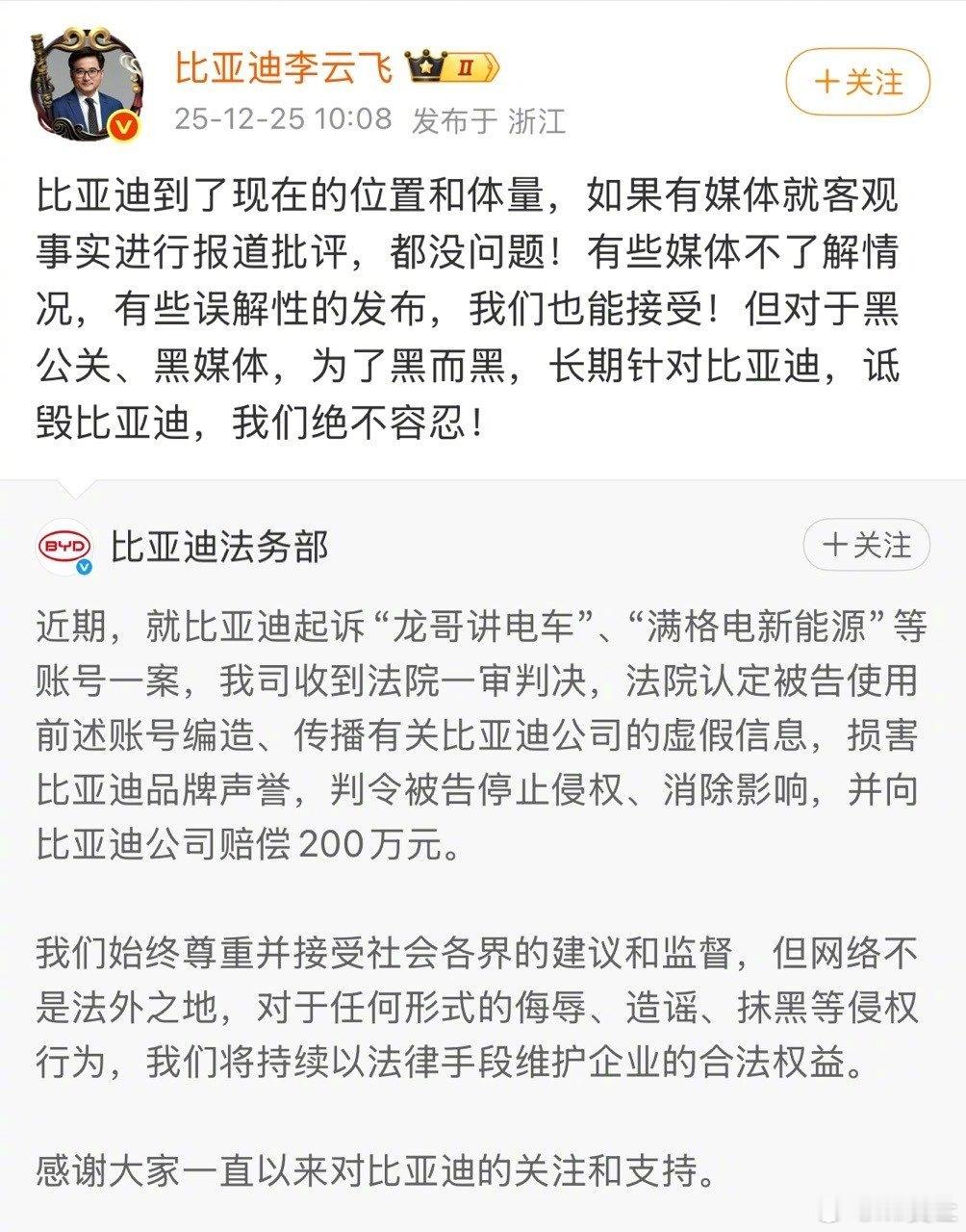 法院判决自媒体赔偿比亚迪200万元比亚迪法务部发布声明:近期比亚迪起诉“龙哥讲电车”、“满格电新能源”等账号一案,收到法院一审判决,法院认定被告使用前述账号编造、传播有关比亚迪公司的虚假信息,损害比亚迪品牌声誉,判令被告停止侵权、消除影响,并向比亚迪公司赔偿200万元。同时,比亚迪表示始终尊重并接受社会各界的建议和监督,但网络不是法外之地,对于任何形式的侮辱、造谣、抹黑等侵权行为,我们将持续以法律手段维护企业的合法权益。比亚迪集团-品牌及公关处 总经理 李云飞也表示,媒体就客观事实进行报道批评没问题,误解性发布也能接受,但是对于黑公关、黑媒体,为了黑而黑,长期针对比亚迪,诋毁比亚迪,我们绝不容忍!这一胜诉,可以看出比亚迪对于网络上对车企的恶意诋毁、虚假造谣等抹黑行为的零容忍,成功捍卫了自身品牌声誉与合法权益,以头部企业的责任担当为新能源汽车行业划定了网络言论红线,而且打击黑公关一直在行动,相信未来也会有更多的车企采取行动捍卫自身品牌权益。