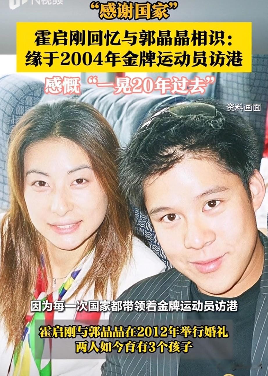 霍启刚专访: 感谢国家,带领金牌运动员访港,我就是在20年前运动员访港过程中,邂逅郭晶晶,爱上郭晶晶,改写了一生幸福! 霍启刚怀着感恩之心,在专访中回忆了自己与妻子相遇相识,最后相知相爱的过程,同时在社交平台上晒出了保留了20年的,与郭晶晶相识时的旧照。 还不忘并大赞妻子洒狗粮:“一晃过去也20年的时间,我们3个孩子,她也很上心地去照顾他们的成长。” 金牌运动员访港,不但在情感上强化认同,在精神上给予激励,在实践中推动合作,并展望一个携手发展的共同未来。 也让香港同胞切身感受国家强盛,强化爱国情怀。