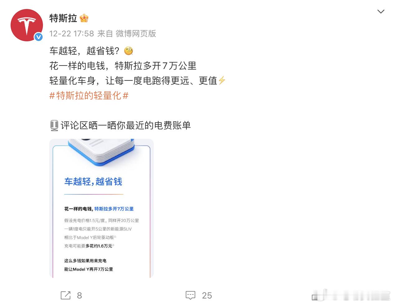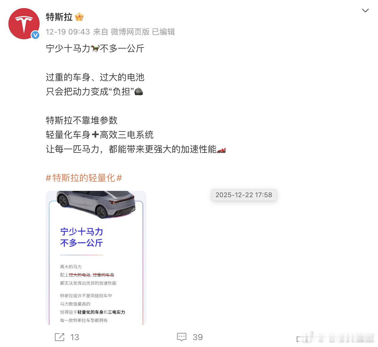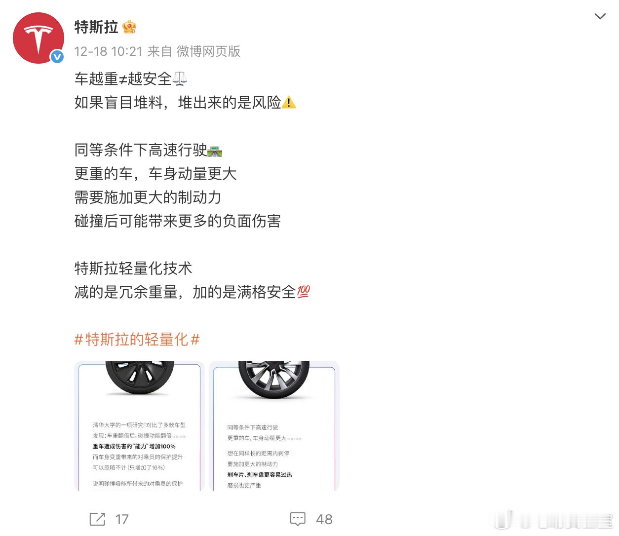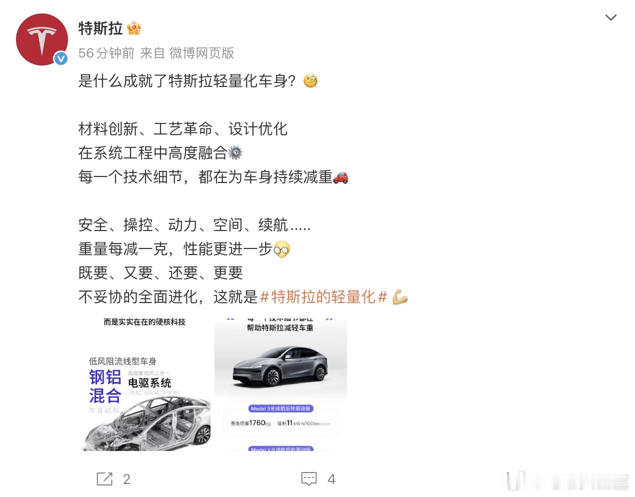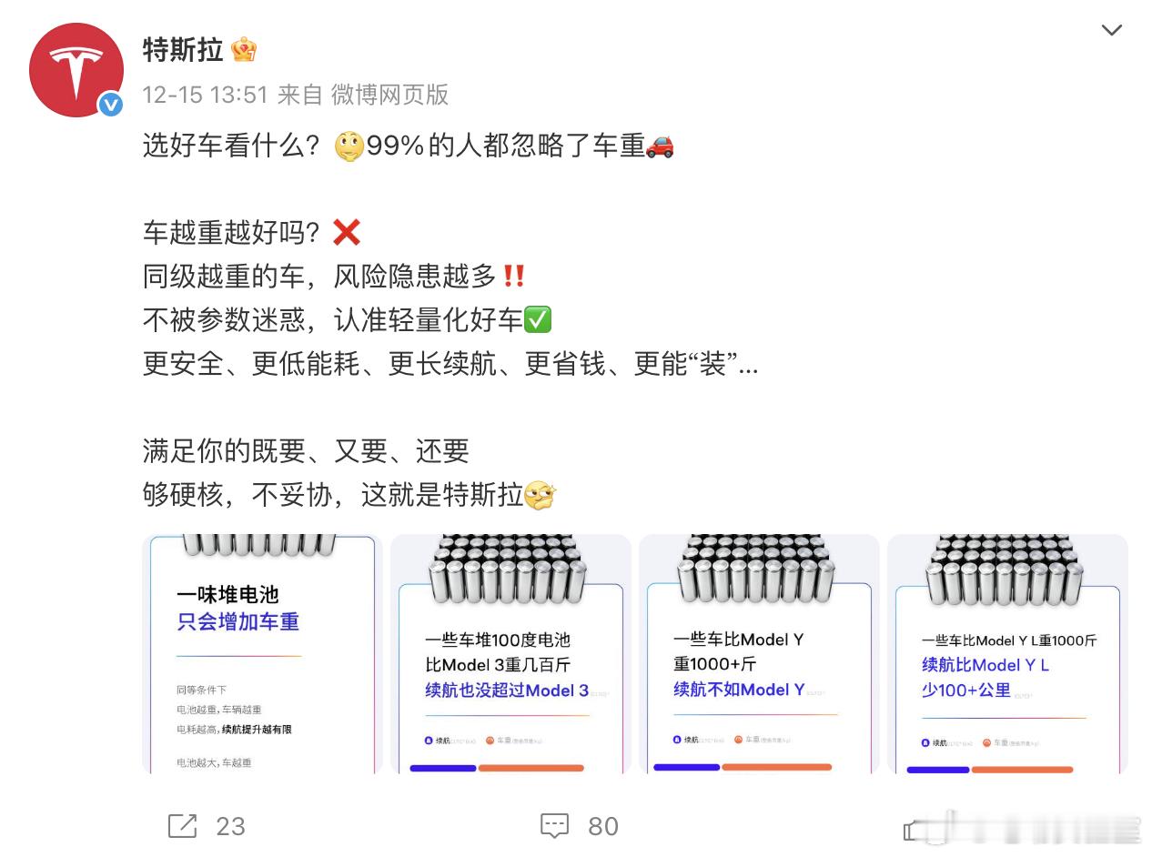 从12月15号开始,特斯拉已经发布了7条关于车身轻量化的微博了里面都是在强调特斯拉在车身轻量化、低能耗方面的技术,并向大家“科普”车身轻量化对安全、经济、动力、续航方面带来的好处。从客观上来说,虽然当下电动车的因为马力较为“廉价”,所以动辄2-3吨的车身在日常使用的时候都不会有太过分的累赘感,但是在激烈驾驶、紧急避险的情况下,轻量化的车身确实能够在操控层面上带来无可替代的增益,毕竟物理法则是客观存在的,更重的车身就是会带来更大的惯量。但那是对于主流消费者来说,又是否愿意牺牲各类舒适的配置和豪华内饰,来换取驾控上的提升呢?特斯拉大V聊车