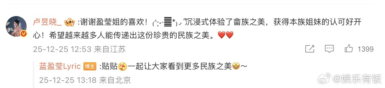 蓝盈莹转发卢昱晓畲族服饰写真卢昱晓穿畲族服饰被蓝盈莹夸好看 谁懂这波美女贴贴!离开厦门前体验福建畲族服饰,写真里黑红撞色的传统服饰 + 珍珠银饰衬得她又美又有韵味~看到后转发了卢昱晓的微博还夸晓晓 “好看”,晓晓回复 “获得本族姐妹认可好开心”,俩人还约着一起传递民族之美,这是什么双向奔赴的美好互动!畲族服饰的精致和美女的适配度真的拉满了