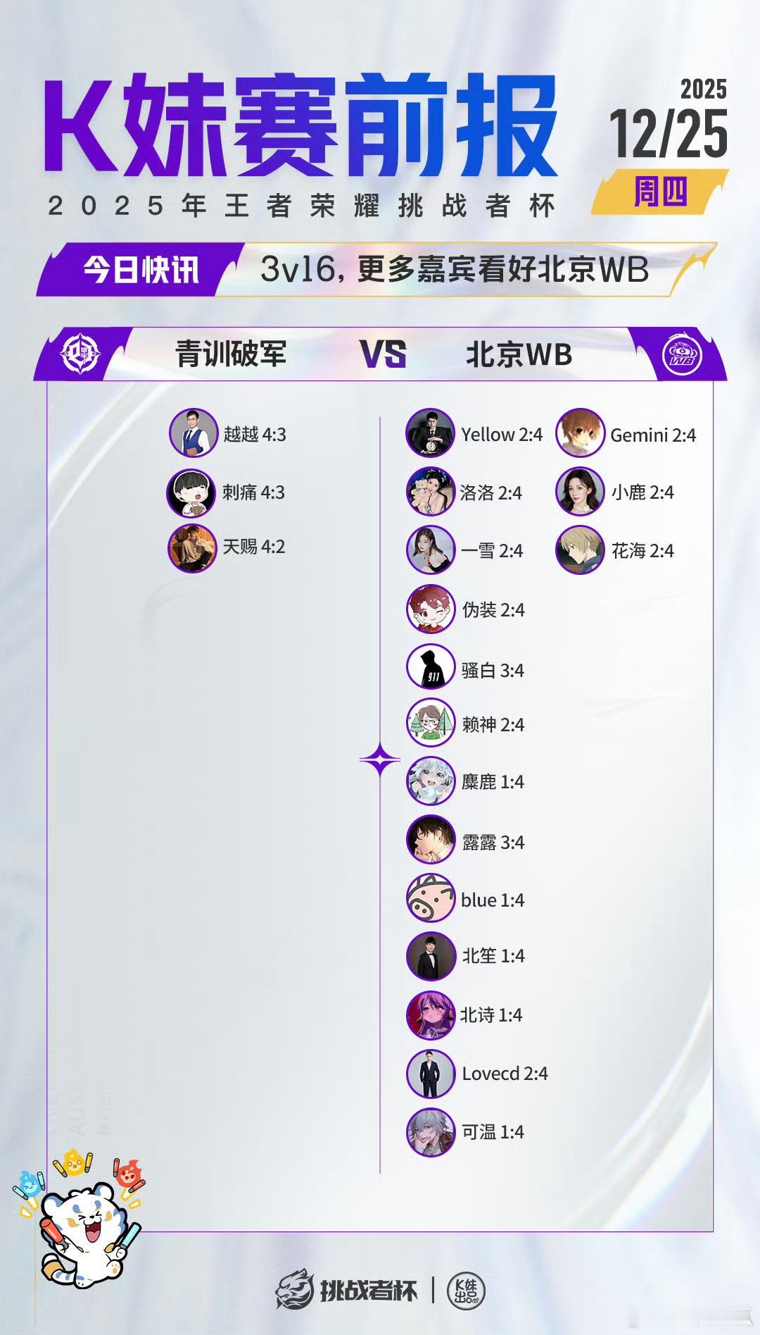 2025王者荣耀挑战者杯|K妹赛前报6v13,更多嘉宾看好济南RW侠;3v16,更多嘉宾看好北京WB。