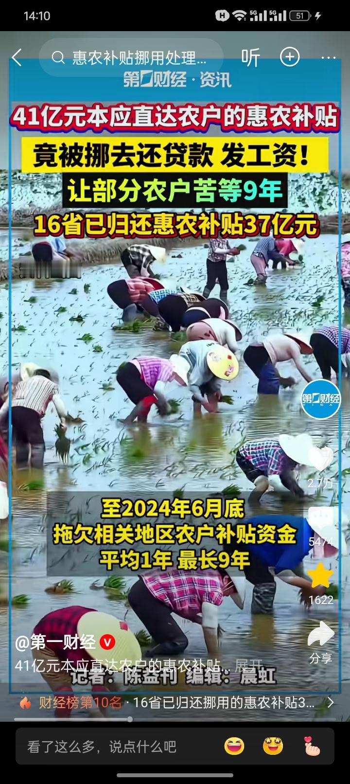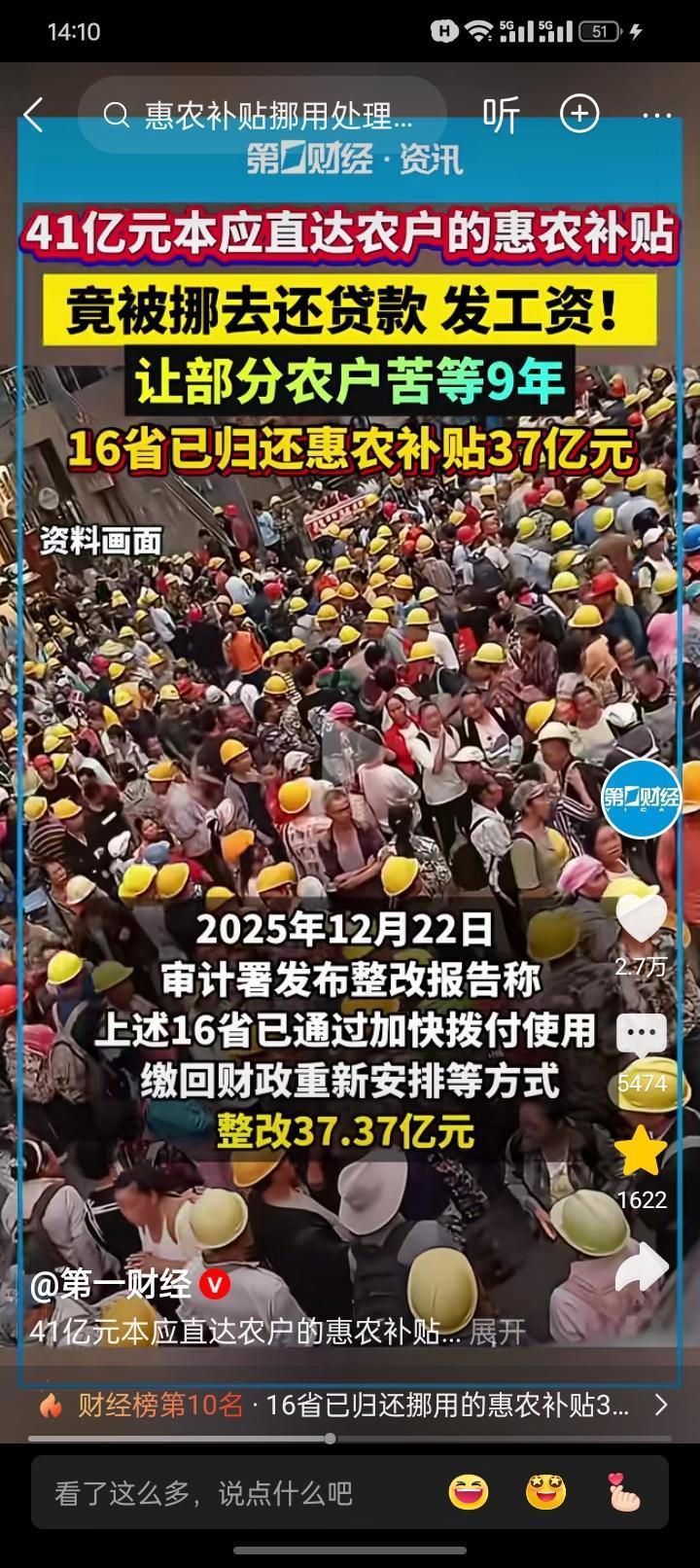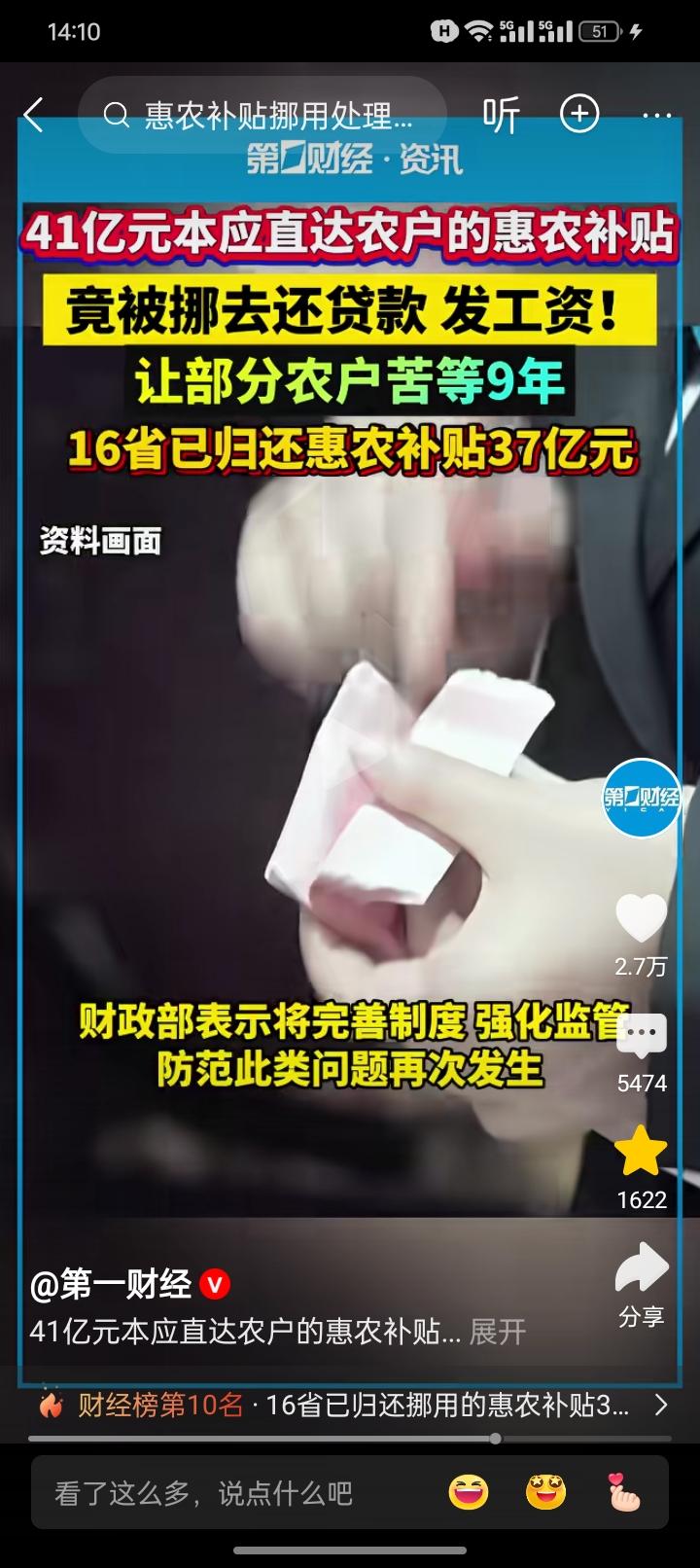 做的实在有点过分了吧! 本来直接可以发到农户手上的惠农补贴,竟然被政府部门挪用去发工资放贷,不少人看到这样的新闻,简直都要气炸了,这些人怎么敢这样做呢? 16个省178个县,直接把41个亿的惠农补贴截流挪用,让本来应该很快拿到补贴的农户,等到最少1年,甚至有等到9年都没有拿到补贴的。 而这些人把本来发给农户的钱拿来直接给自己发工资了,难道他们自己重要,农户就不重要,种地的靠天吃饭,化肥农药这都是需要用到钱的啊! 如果用一个词来形容这些人的行为,“中饱私囊”恐怕再合适不过了吧。 目前16个省挪用的41个亿,已经追回了37亿,这些铺贴又要再一次发给农户。很奇怪的是,这位惠农补贴为什么就不能直接打到农户的账户上,非要在中间这些人过一手呢?农业补贴新政 农业生产补贴 种田补贴 农业农村补贴