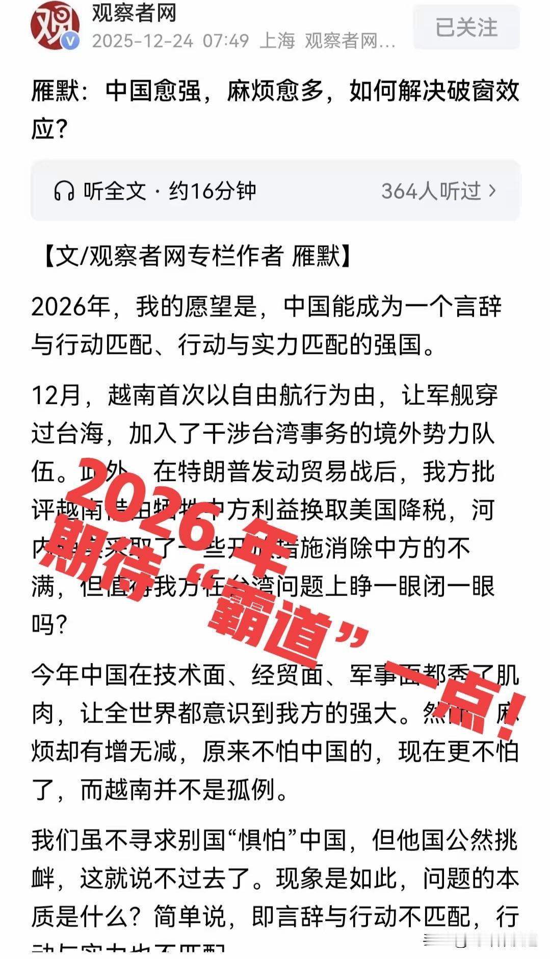 看了雁默文章:中国愈强,麻烦愈多! 期待破解! 作为 一个中国人来说,当然也希望国家越来越强大,国家强大了越来越安全,国泰民安 ,世界和平,但实际上确实麻烦更多了,中国展现出来的强大的能力,没能换来中国在世界上应有的受尊重地位,而换来了更多的国家对中国的挑战与威胁,就算是一个小国也敢如此碰瓷! 对于中国核心利益的台湾,中国不管在财力 军事力量 科技力量可以说是完胜台湾之时,但台独赖清德对中国大陆的挑衅 在 2025 年达到了一个巅峰! 而拿中国台湾做文章的国家 就有日本汲台危险言论,有美国 111 亿史上最大军售,并拿中国台湾向中国施压,讨价还价。 在南海,远在大洋洲 远在北半球的国家 军舰多次均驶向了南海 ,以航行自由为由,向中国展现那种微不足道的军事力量,但他们就这么干了! 在贸易方面,虽然中美之间经过艰辛的谈判,但美国对欧洲 对东南亚国家的关税施压,也让这些国家开始“出卖中国利益”而换取美国对其关税的照顾,虽然中国在 2025 年取得了 史上最大的 1 万亿贸易顺差,但也就变成了咱们的劣势! 所以为什么感到咱们很委屈,中国有如此强大的实力了,但没有展现“霸道”的一面,这个世界依然没有将咱们的实力放在眼里,因为他们懂得咱们不会轻易你伸出“爪子”更不会露也獠牙,他们“不怕”咱们。这种是咱们力感心理难过的地方。 所以也期望 2026 年尹始,咱们有了实力王道之后,更能展现出应有的“霸道”!降低外界对咱们的敌视,消除更多的外部威胁,让咱们中华民族能真正的立于世界的东方,也更具有敢打敢拼的真实力量展现 包括经济 政治 军事 全方面的展现,让咱们国家有一个更加稳定的国际环境,展现应有的“霸道”! 以上仅代表个人见解!
