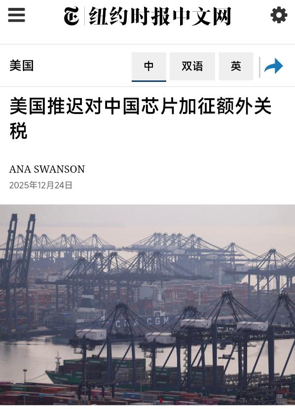 国在半导体领域上演了一出“变脸大戏”!纽约时报中文网12月24日发文写道:“特朗普政府表示,中国在半导体行业日益增强的主导地位使美国公司、劳动者和经济处于不利地位。但美国贸易代表办公室还是决定,至少在未来18个月内不对中国芯片加征额外关税。” 这波言行不一的操作,堪称年度“变脸大戏”,前脚还把中国半导体当成头号威胁,后脚就给关税政策“踩了刹车”。 不少人看得一头雾水,美国这是唱的哪一出?说白了,不是他们良心发现,而是自家利益实在绷不住了。 要搞懂这波反转,得先说说特朗普政府之前的强硬姿态。 自特朗普上台后,他们就把半导体领域当成遏制中国的核心战场,不仅升级了对中国芯片企业的技术封锁,还逼着盟友一起搞“芯片联盟”,想把中国踢出全球半导体产业链。 2025年上半年,美国贸易代表办公室还多次放风,说要对中国半导体产品加征额外关税,当时不少美国芯片企业都慌了神,纷纷组团去游说政府,生怕这波关税把自己的生意搞黄了。 这些企业的担心不是没道理,中国不只是全球最大的芯片消费市场,更是半导体产业链里的关键一环。 美国半导体行业协会2025年10月的数据显示,美国芯片企业有25%的营收来自中国市场,要是加征高额关税,这些企业的利润会直接腰斩。 更关键的是,很多美国芯片企业的生产环节离不开中国,比如高通、英特尔的不少中低端芯片,都是在中国代工生产的。 要是加征关税,要么自己承担成本导致产品涨价失去竞争力,要么转移生产线,可重建生产线至少要3到5年,成本更是天文数字。 这也是为啥美国企业反对加征关税的声音一直没停过。 2025年8月,高通、英特尔、英伟达等多家美国头部芯片企业联合致信美国贸易代表办公室,明确表示加征关税会“严重损害美国半导体产业的全球竞争力”,还会让美国消费者为电子产品买单。 特朗普政府嘴里说“中国半导体主导地位不利美国”,可心里比谁都清楚,现在还没到跟中国芯片产业彻底撕破脸的地步。 今年中国海关的数据显示,前11个月中国半导体出口额同比增长6.2%,其中对美出口的中低端芯片还在稳步增长,这些芯片在美国汽车、家电等行业里根本找不到替代品。 有个细节很有意思,美国这次推迟关税的期限是18个月,刚好卡在2027年美国大选之后。 这波操作说白了就是“缓兵之计”,既暂时安抚了国内企业,又把难题留给了下一届政府,但不得不说,美国政客这套“甩锅”的本事,确实练得炉火纯青。 可能有朋友会问,中国半导体真的已经达到“主导地位”了吗? 客观说,在高端芯片领域,我们和美国还有差距,但在中低端芯片、芯片封装测试以及相关设备材料领域,中国已经形成了完整的产业链,全球市场份额不断提升。 美国之前的打压,反而倒逼中国加快了自主研发的步伐,去年中国芯片自给率达到30%,比2020年提高了13个百分点,今年国产28纳米芯片量产,更是打破了国外企业的垄断。 美国正是看到了这一点,才更怕彻底切断合作会让中国加速实现全面自主。 此事为全球产业链敲响警钟。当下,半导体产业已然深度交融、相互依存。妄图推行“脱钩断链”之举,实乃不切实际之妄想。 美国想靠关税和封锁遏制别人,最后只会伤到自己,那些喊着“脱钩”的政客,大概率是没搞懂产业链的基本逻辑。 大家可以换位思考一下,要是你是美国芯片企业的老板,一边是35%的营收来源地,一边是政府的政治施压,你会怎么选? 企业首当其冲是要维系生意,追求利润,而非响应政客的空洞口号。权衡之下,保住生意才是当务之急,这正是美国政府最终妥协的核心缘由。 美国此番“变脸闹剧”,实则为霸权思维与经济现实的激烈交锋。他们妄图凭恃强权维系技术垄断,奈何市场规律铁律在前,绝非几句政治口号所能左右。 中国半导体产业的崛起,不是靠谁的恩赐,而是靠无数科研人员的努力和市场的选择。 美国的妥协不过是权宜之计,技术自主仍需自力更生。唯有切实掌握核心技术,方可于国际竞争中稳立潮头,摆脱他人“变脸”的掣肘,走出一条坚实的自强之路。