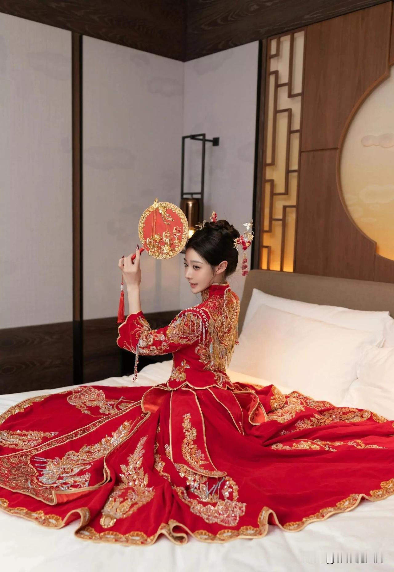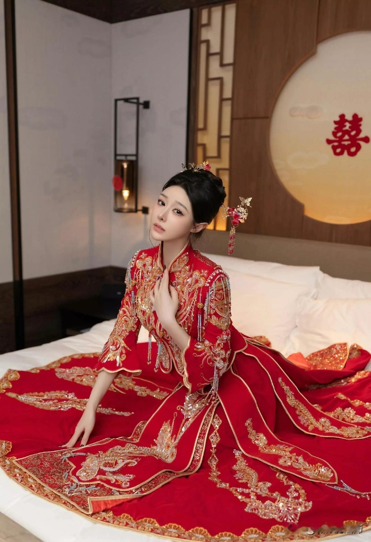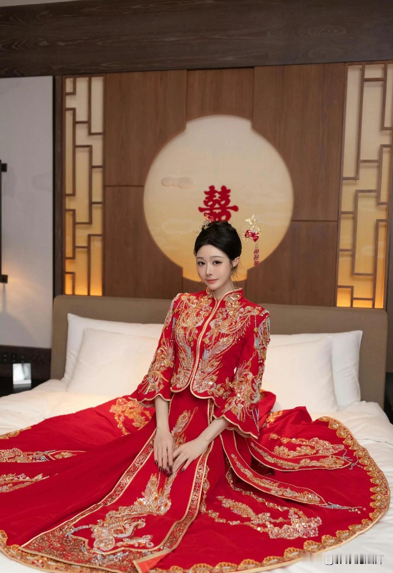 镜头里,正红秀禾服艳得抓眼,金凤凰在衣上“飞”着,珍珠流苏随动作轻晃,新娘手里的金扇画着牡丹和蝴蝶,背后大“囍”字一衬,中式婚礼的喜庆劲儿扑面而来。 这衣服形制有讲究:立领对襟显端庄,宽袖口收在手腕处,既保留传统婚服的庄重,又因腰身收褶、裙摆垂坠,穿起来更显精神。要是身材娇小,选短上衣配长裙更合适;想显瘦,A字收腰裙能把身材比例拉得更漂亮。 颜色上,正红是“喜庆担当”,自古就代表吉祥好运,配上金线刺绣,红金撞色又贵气,暗合“阴阳调和”的老理儿,盼婚姻和和美美。 细节里全是祝福:凤凰是“百鸟之王”,显新娘尊贵;牡丹代表富贵,蝴蝶寓意爱情,“凤凰+牡丹+蝴蝶”的组合,把“婚姻幸福、家族兴旺”的盼头都缝进了衣服里。 这袭红衣,不只是嫁衣,更是老祖宗对幸福婚姻的祝福,在一针一线里传承着东方美学。中式秀禾照 中式秀禾服婚礼
