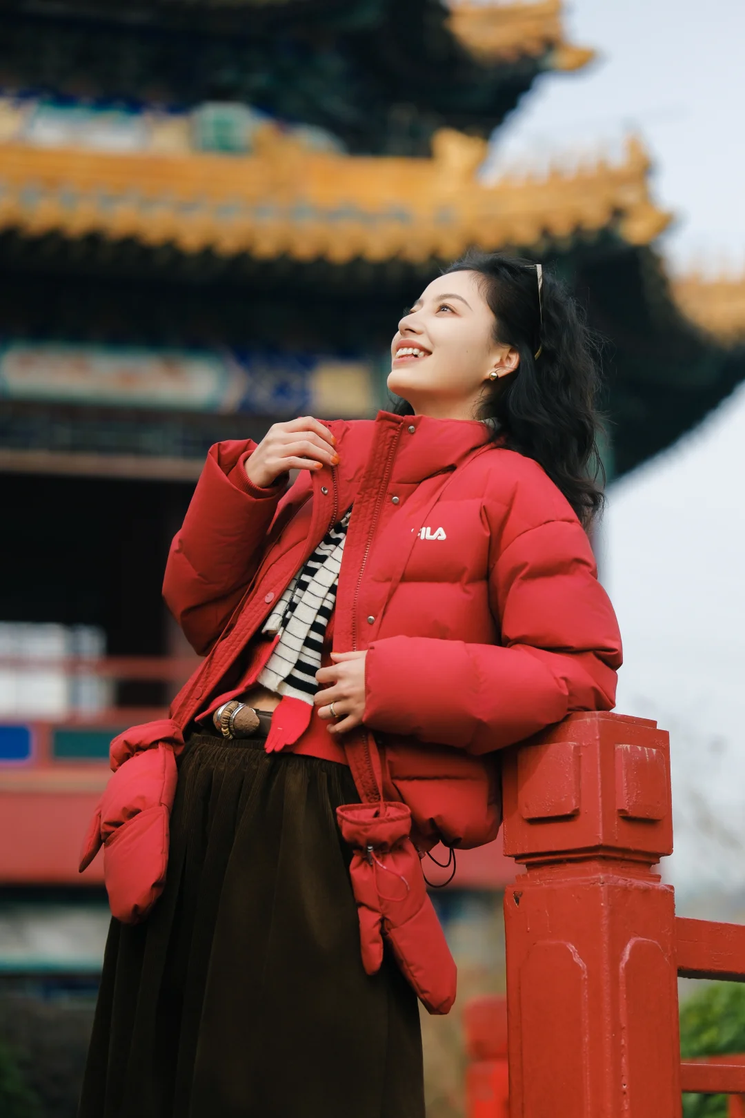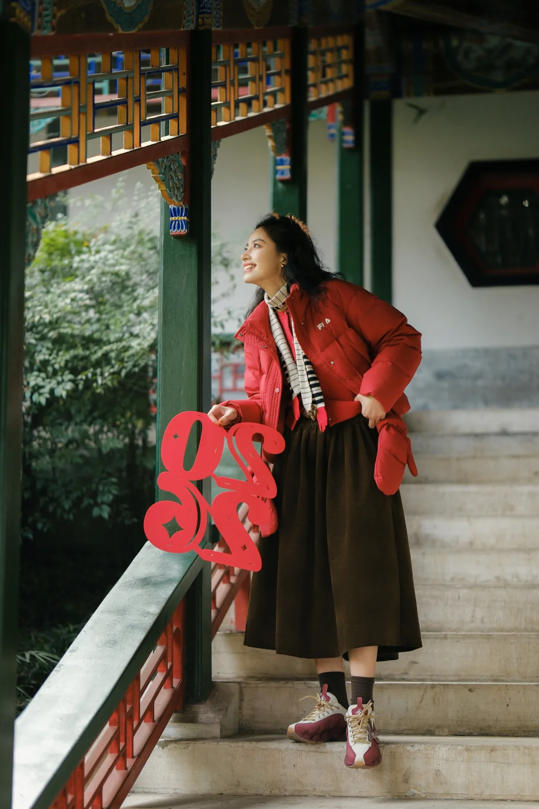 立领红色羽绒服保暖又亮眼,搭配带小马装饰的FILA VETTA新年配色老爹鞋,保暖时髦两不误。穿上它在园博园的中式建筑里穿梭,不仅暖乎乎过新年,镜头里的身影也很很有新年氛围~