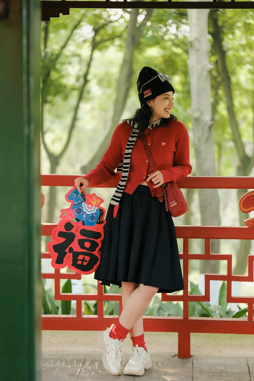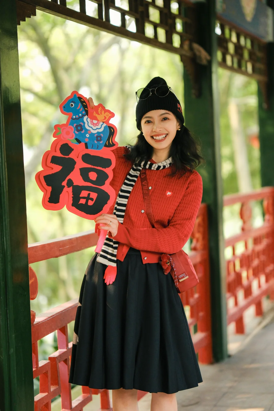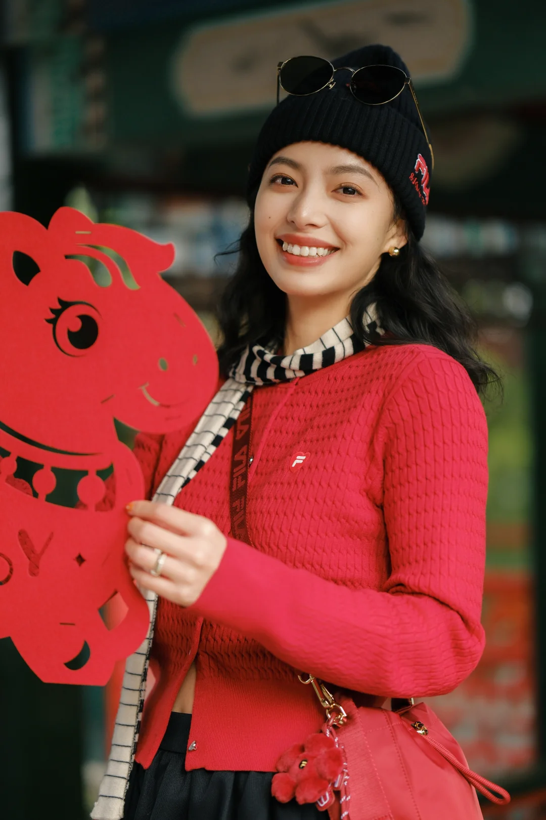 它不是那种扎眼的正红,而是像脸颊自然透出的红晕,衬得人肤白透亮,气色一下子“飞升”✨叠穿黑色百褶裙,经典配色不出错。高腰设计的毛衣很好地修饰身材比例,柔软亲肤的面料贴身穿也很舒服,举手投足间都是温柔的新年气息~配上小红灯笼在朱门廊下走动,感觉整个人都在发光,真的马上起飞!