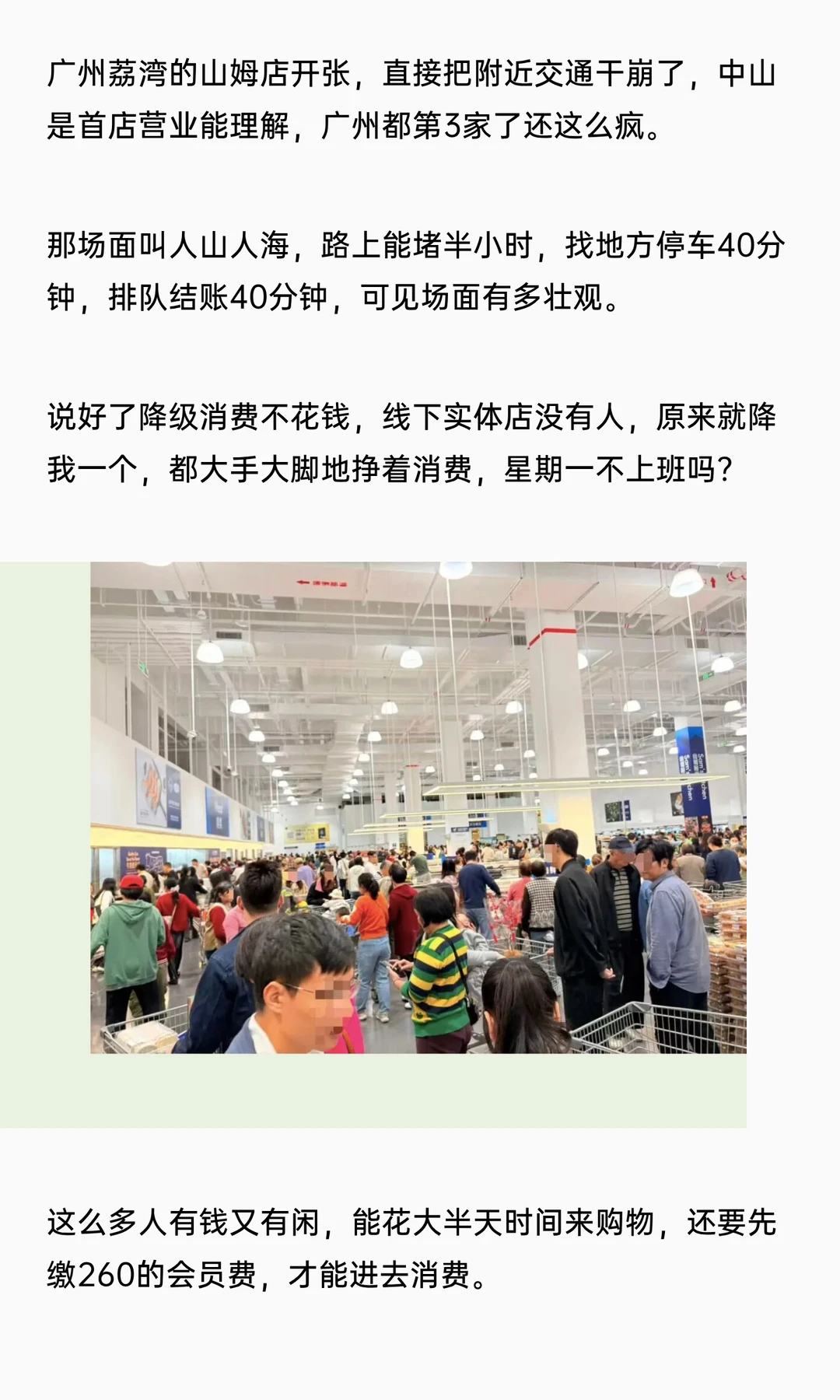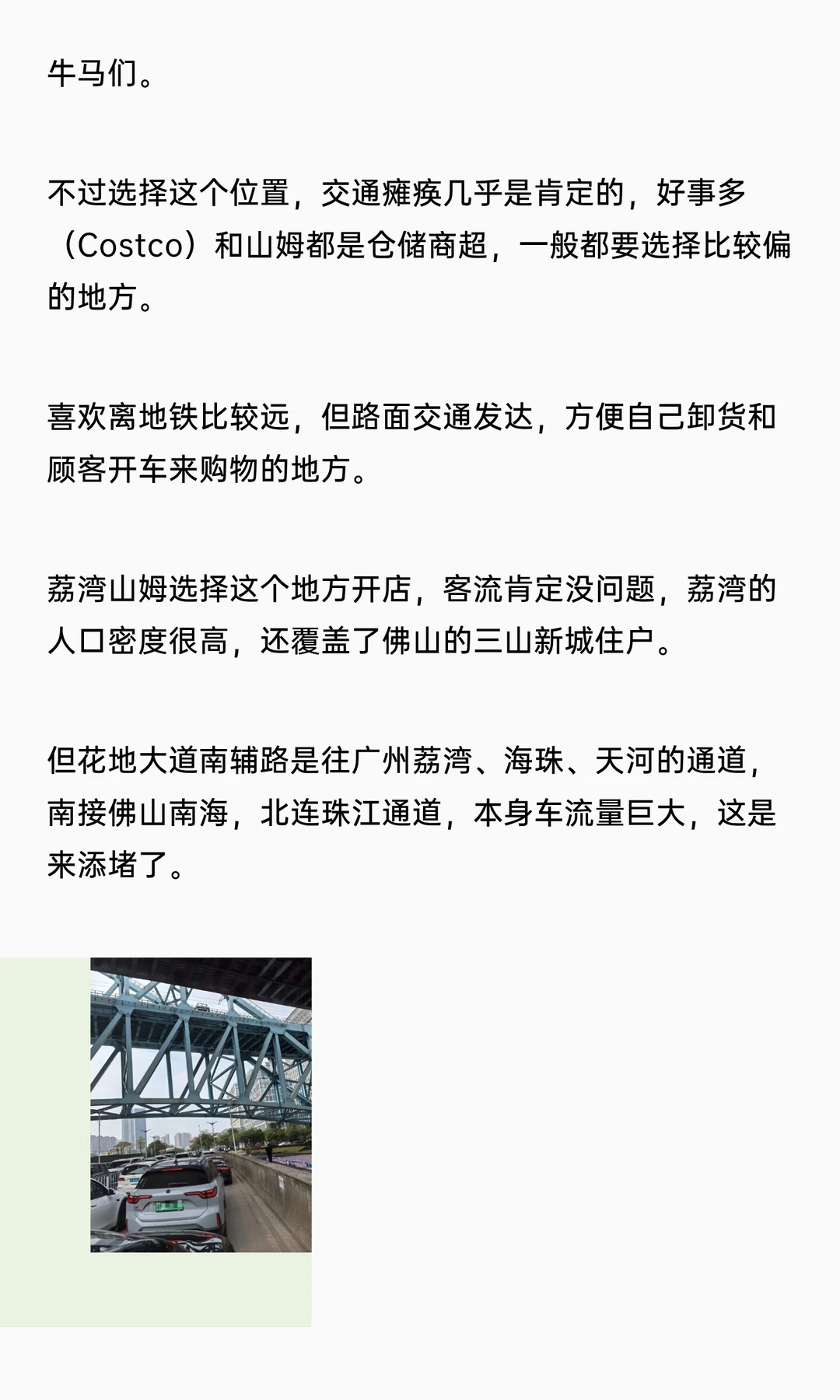 枝头乱舞 5 2025-12-25 15:54 广州芳村荔湾山姆店第一天开业,我们不敢开车怕堵车厉害只能坐地铁再转公交到,果然有少堵还不算厉害至于顾客进去消费就人山人海如潮,从门口进商场慢步放行时间足足二十多分钟才能进到商场大门口,从商场佈局整体不如,天河区三溪山姆店和海印又一城山姆店,希望下一步得到完善管理方式吧。