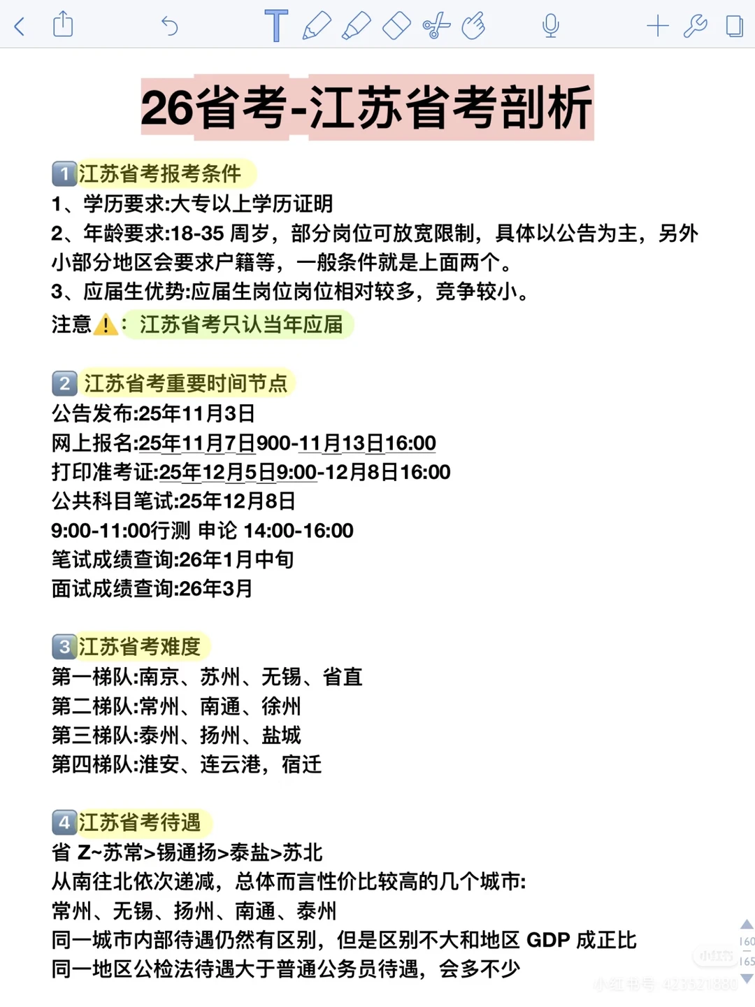 江苏的同学别迷茫,还有很多进体制的机会!现在开始打破信息差,充分了解考试信息,上岸真的不难!! - ⚠️江苏考公难度 第一梯队(★★★★★):南京、苏州、无锡、省zhi 第二梯队(★★★★):常州、南通、徐州 第三梯队(★★★):泰州、扬州、盐城 第四梯队(★★):淮安、连云港,宿迁 - ⚠️江苏进体制内的机会 1、国考:10月15日报名,12月1日考试 2、江苏省考:11 月报名,12月考试 3、江苏选调生:10-11 月报名,10-12月考试 4、江苏事业单位统考:3月报名,4月考试 5、文职管理岗技术岗:10月报名,12月考试 6、文职技能岗:7-12月报名,8-12月考试 7、国家电网江苏电力:11月报名,12月考试 8、江苏烟草:3-4月报名,4-5月考试 9、江苏中烟工业:3月报名,4月考试 10、六大银行:9-10月报名,10-11月考试 11、三桶油:9-10月报名,11月考试 12、西部计划:4-5月报名,5月考试 13、江苏三支一扶:6月报名,7月考试 - ⚠️考公备考规划 1⃣基础阶段 1.跟系统课程至少过一遍,对各个模块内容、重难点、出题逻辑有清晰的认知 2.晨读背诵:半月t上面的时政热点积累申论素材 3.每天题量:言语25判断35数资25常识15 4.申论行测同时进行,申论在前期可以少但不能不练 - 2⃣ 专项拔高阶段 根据自己的薄弱模块去找固定的老师听课,选择适合自己的名师 1.判断:花生十三判断刷题、龙飞图推刷题 2.言语:郭熙100题、欣说、阿里木江刷题 3.数量:花生十三数量1200题、高照数量专项训练、齐麟刷题(练常考题型) 4.资料:高照超大杯、齐麟、花生十三 5.常识:FB(分模块刷) 6.申论:李梦圆、站长申论刷题(每天一套,每周一篇大作文) 每天言语30题+判断30题+数资30题+常识15题 - 3⃣刷题冲刺阶段 1.行测:花生十三两期套题冲刺、常识时z、热点课 2.申论:站长申论真题班 上午行测下午申论,晚上解析和复盘近10年国考和省考的真题,考前刷3遍,总结错题查漏补缺 - 4⃣考前冲刺阶段 1. 严格按照考试时间,早上一套行测,下午一套申论,写在答题纸上。晚上复盘,保持状态到考前。 2.错题集完完整整的再过至少3遍,不同颜色重新标记难点和知识模糊点,对于变型较多 /复杂的题型,重点关注