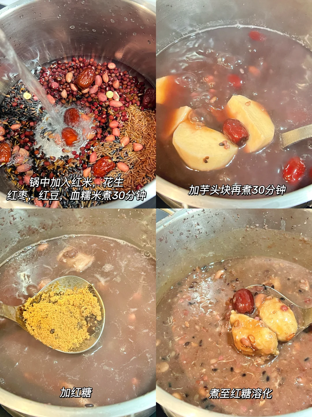 1️⃣锅中放入红米,红豆,红枣,红皮花生,血糯米,大火烧开后小火煮30分钟。