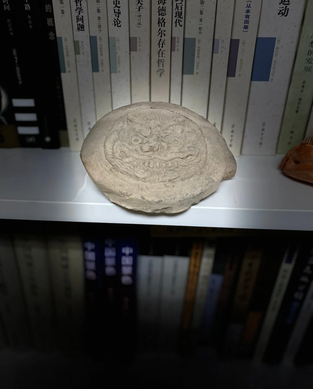 书架上有一块瓦当。很有来历,真正的古董。那是十几年前我去陕西靖边县沙地中的统万城遗址。回来时,住在一个村庄,去看一块压砂田,在那块田里捡的,当时是秋天里,压砂田里满是石块,压砂田是干旱区农田一种抵抗蒸发,保墒保水的做法,就是在田里摆石块。在满地的石块中,我看到一块石头比较特别,正对着我,好像一直在等待我,我就把它捡了起来,一看是一块瓦片一样的东西,但上面沾满了泥巴,在无定河边,就是“可怜无定河边骨,犹是春闺梦中人”中的那个无定河,我把这块沾满泥巴的瓦片泡在河水里冲洗,一会让我惊喜的事发生了,原来这是一块有着精美图案的瓦当,这个图案雕的是中国古代四大著名神兽之一:饕餮。饕餮没有身子与四肢,只有一个硕大的头,头上长着一对肉翅,饕餮能飞,据说它凶残无比,特别喜欢吃和能吃,目光所及,通通吃掉,甚至连自己的身体和四肢都吃掉了。但中国古代尤其是先秦的夏商周,最喜欢用饕餮图案做装饰纹样,尤其是在青铜器上。据美学家李泽厚解释说,那时是国家诞生不久的青春期,朝气蓬勃,血性方刚,到处是你死我活的征战,历史正踏着火与血前行,因此人们崇尚这种血腥勇猛的怪兽,欣赏一种狰狞之美。后来余风流布,这种图案传承下来,出现在一些能够威吓妖魅,保家镇宅的物件上,比如覆盖屋顶的瓦当上。这块瓦当保存十分完整,图案也栩栩如生。老乡告诉我,这东西应该是统万城时期的东西,这里的老乡们也时常捡到这个瓦当。那时候统万城遗址还在荒野里,还没有什么设施,也没有人收门票。但这里却吸引了一些著名的地理学家,其中最有名的是院士北大教授侯仁之,侯仁之做为地理学家最早来到这里,并写出了论文,讲述这里的环境演变与人类活动的关系。后来不断有地理学者前来研究环境是怎样演变的,这里成了地理学的圣地,一批地理学博士论文诞生于此。据我所知,就有北师大副校长史培军,兰州大学地理系主任王乃昂的博士论文都是写这一带的人类社会与环境之间的相互作用。我慕名前往。果然名不虚传,这里确实是一处很有价值饱含环境与文化信息的遗迹。这座城建于东晋那年代,是北方南匈奴铁弗部首领赫连勃勃所建,建城时,周围绿草如茵,河流如带;今日这城已经几乎被沙掩埋。《魏书》和《晋书》都有记载。距今已有1600年的历史。