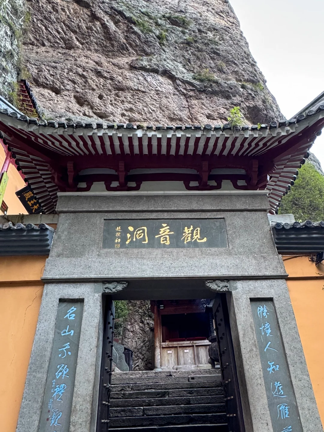 观音洞是雁荡山景区最奇特壮观的建筑群,观音洞所在的山洞崖壁名曰‘合掌峰’,是雁荡山第一大洞,洞高113米,深76米,宽14米,洞内建筑九层。
