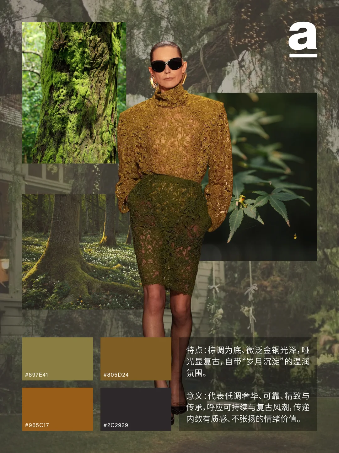🍀青铜迷雾(PANTONE 17-0843 TCX):青铜迷雾是一种暖棕色,底色上笼罩着一层朦胧光晕,带有低调的光泽感,没有张扬的耀眼,却在低调中透出高级格调,自带复古优雅的气质。