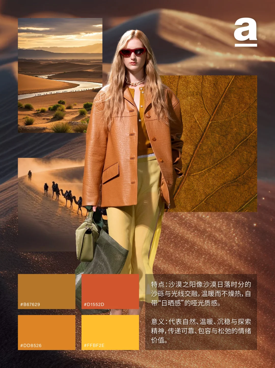 ☀️沙漠之阳(PANTONE 16-1149 TCX):沙漠之阳融合了黄褐色和烤棕褐色,让人联想到沙漠景观中的日落,给人一种温暖、宁静且带有一丝粗犷之美的感觉。