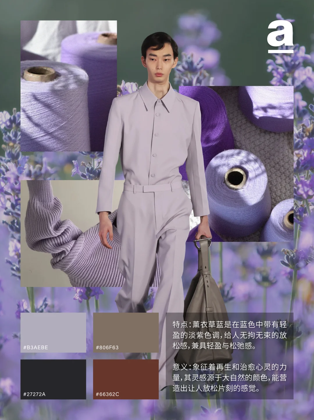 🪻薰衣草蓝(PANTONE 14-3905 TCX):薰衣草蓝低调不抢眼,又有独特存在感,是时尚界永不出错的选择,可与浅灰色搭配,让整个空间或穿搭显得非常平和,给人宁静感。