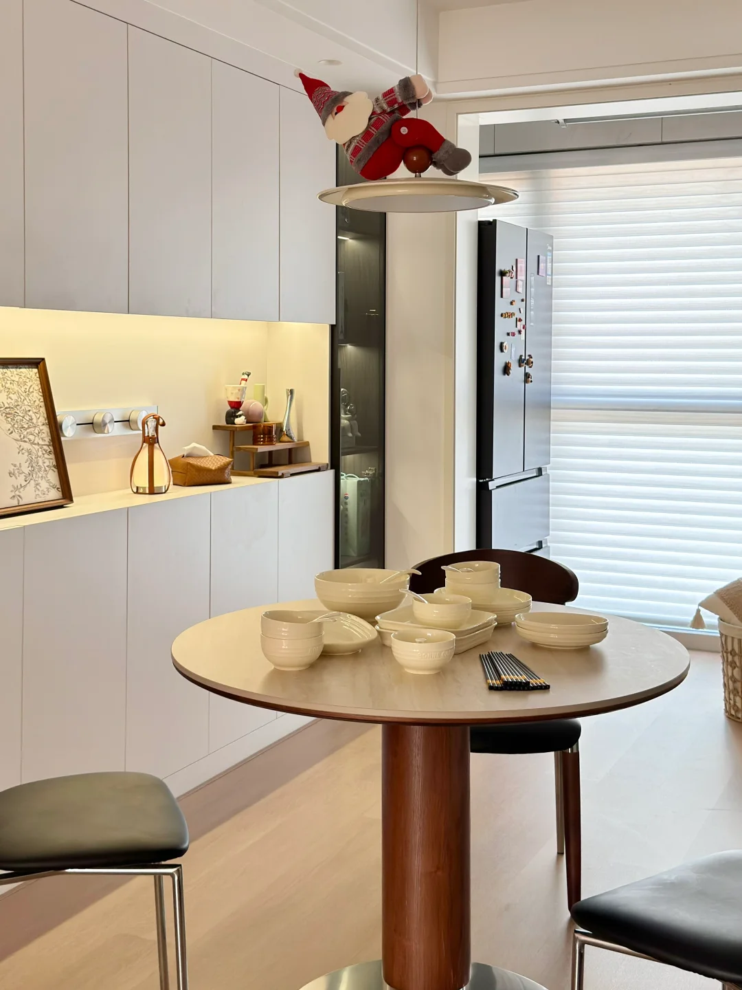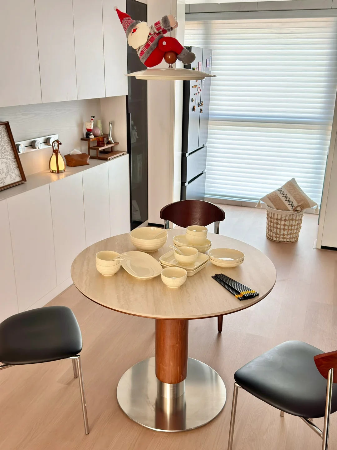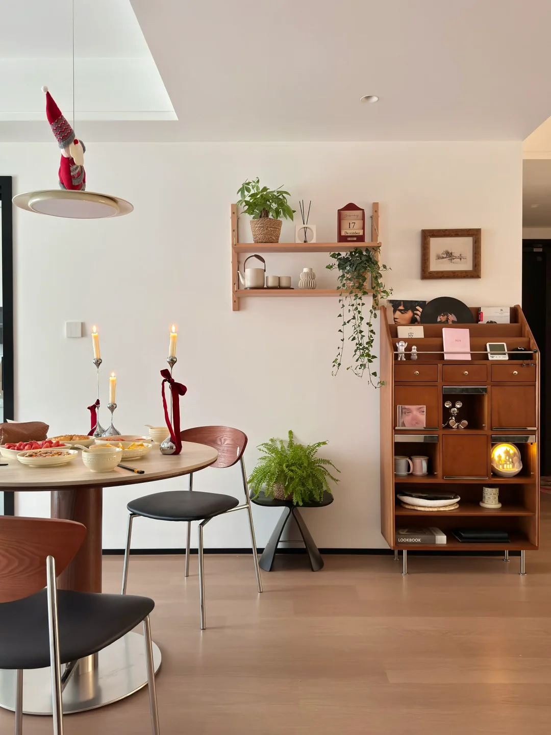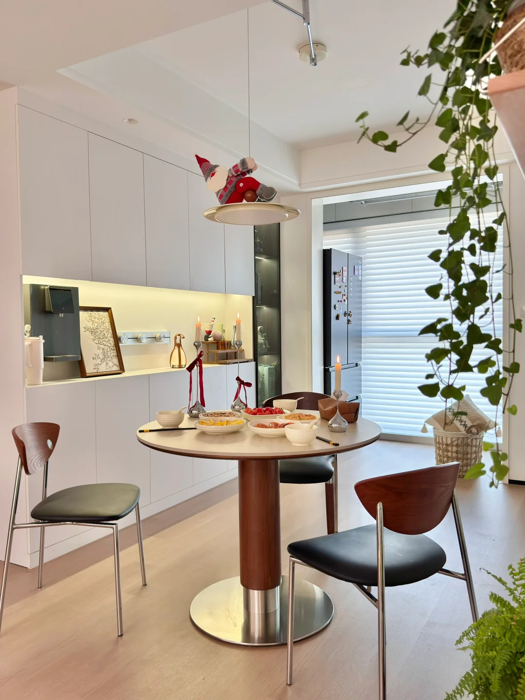 建面135平 套内110平 三室两厅两卫 竖厅户型 今年改造成了喜欢的中古风 软装⚪️🟤配色真的耐看又有质感 餐厅比较小 开间2.7m 做了厚度30cm的餐边柜收纳杂七杂八 餐桌直径1m 不大但是和朋友聚餐也够用了 岩板洞石桌面 颜值高又好打理 喜欢每一个宅家的日子 做点好吃的 追追剧 也太幸福了~