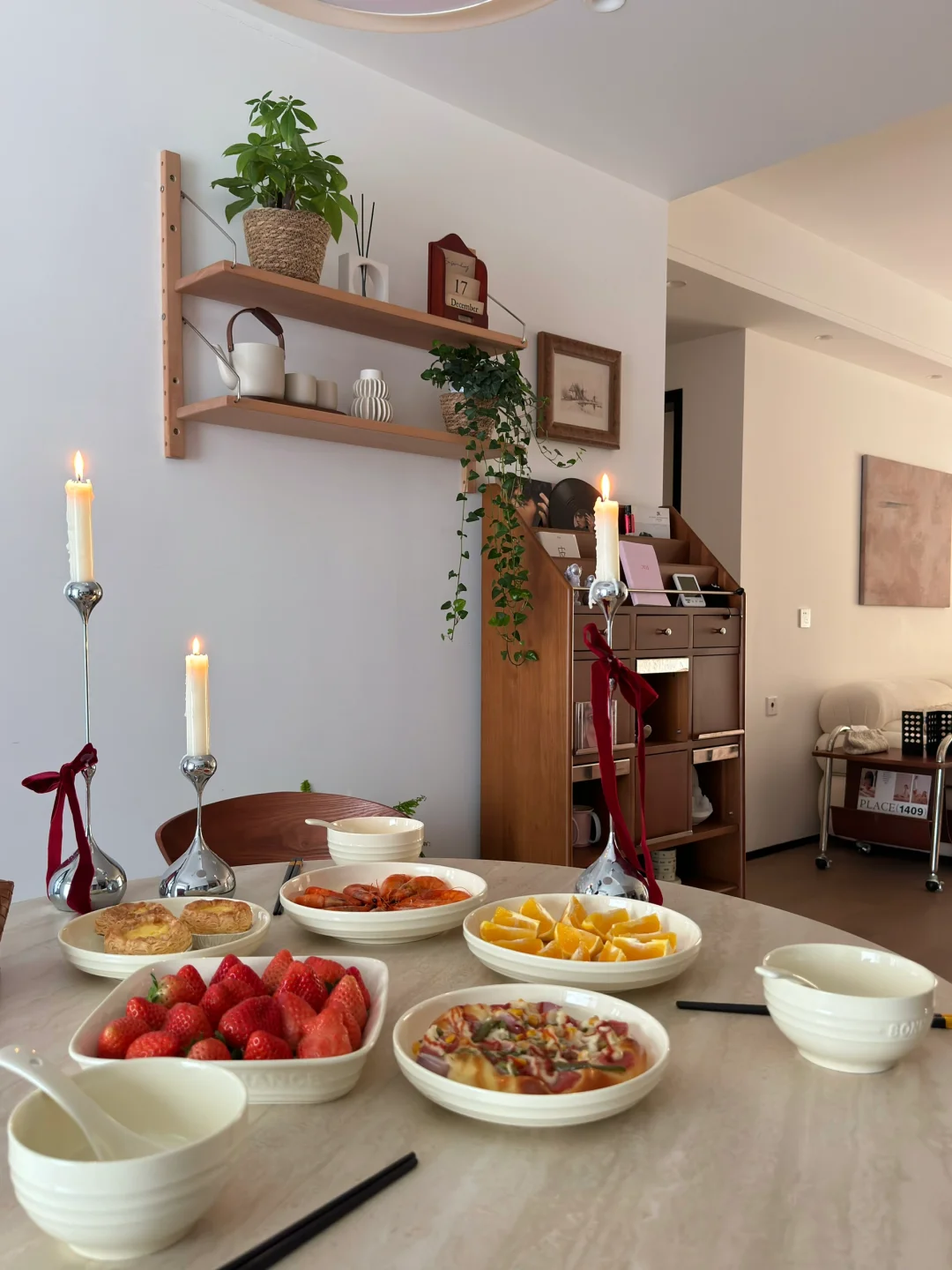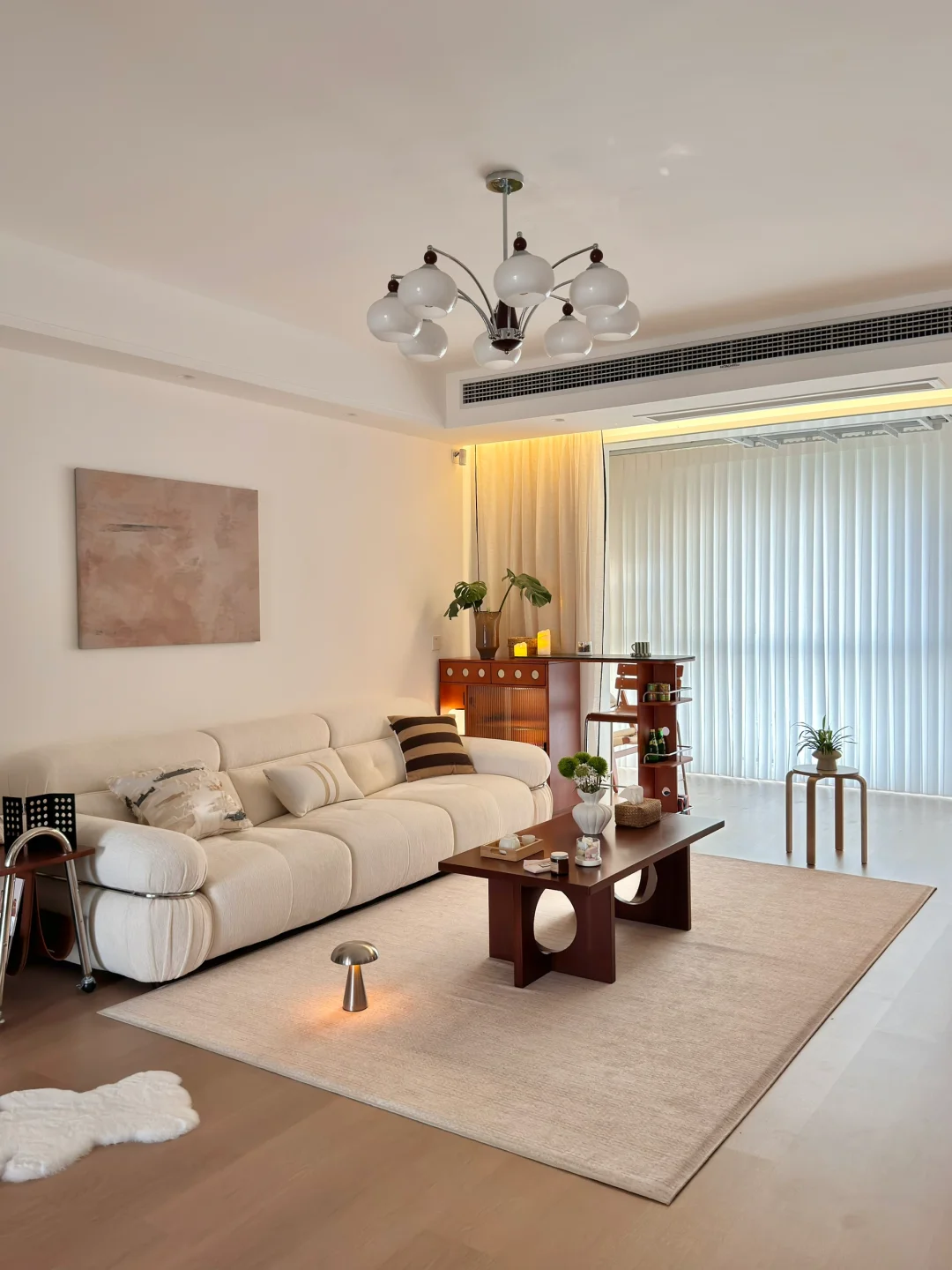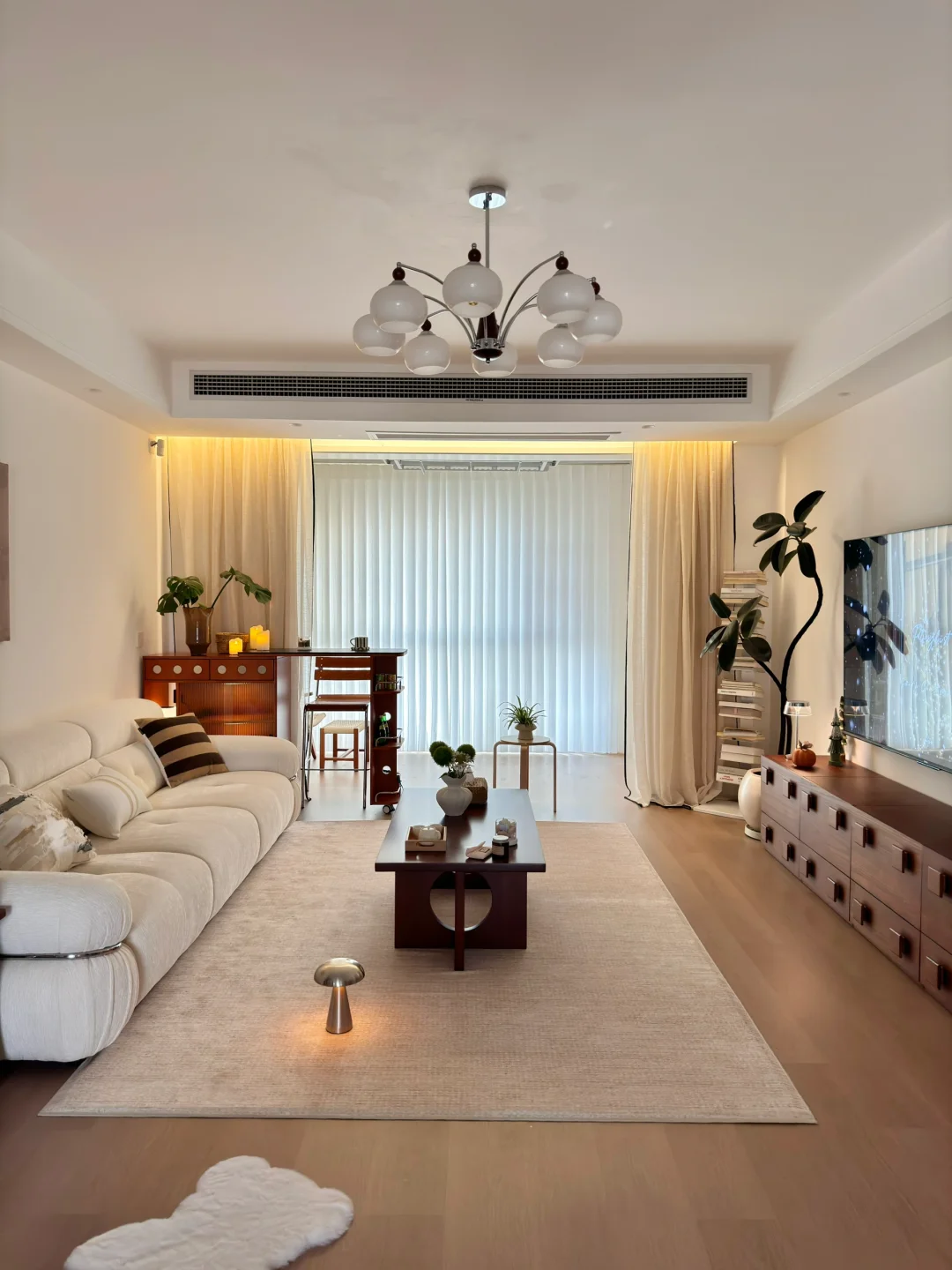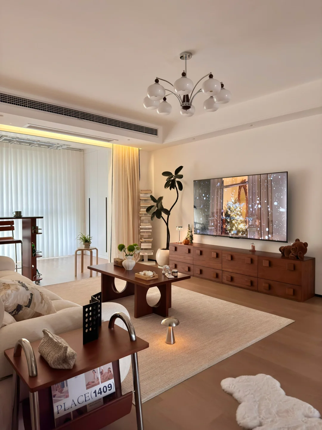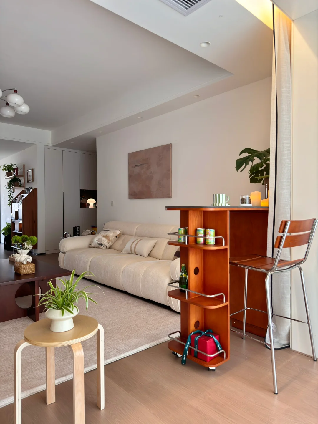 建面135平 套内110平 三室两厅两卫 竖厅户型 今年改造成了喜欢的中古风 软装⚪️🟤配色真的耐看又有质感 餐厅比较小 开间2.7m 做了厚度30cm的餐边柜收纳杂七杂八 餐桌直径1m 不大但是和朋友聚餐也够用了 岩板洞石桌面 颜值高又好打理 喜欢每一个宅家的日子 做点好吃的 追追剧 也太幸福了~