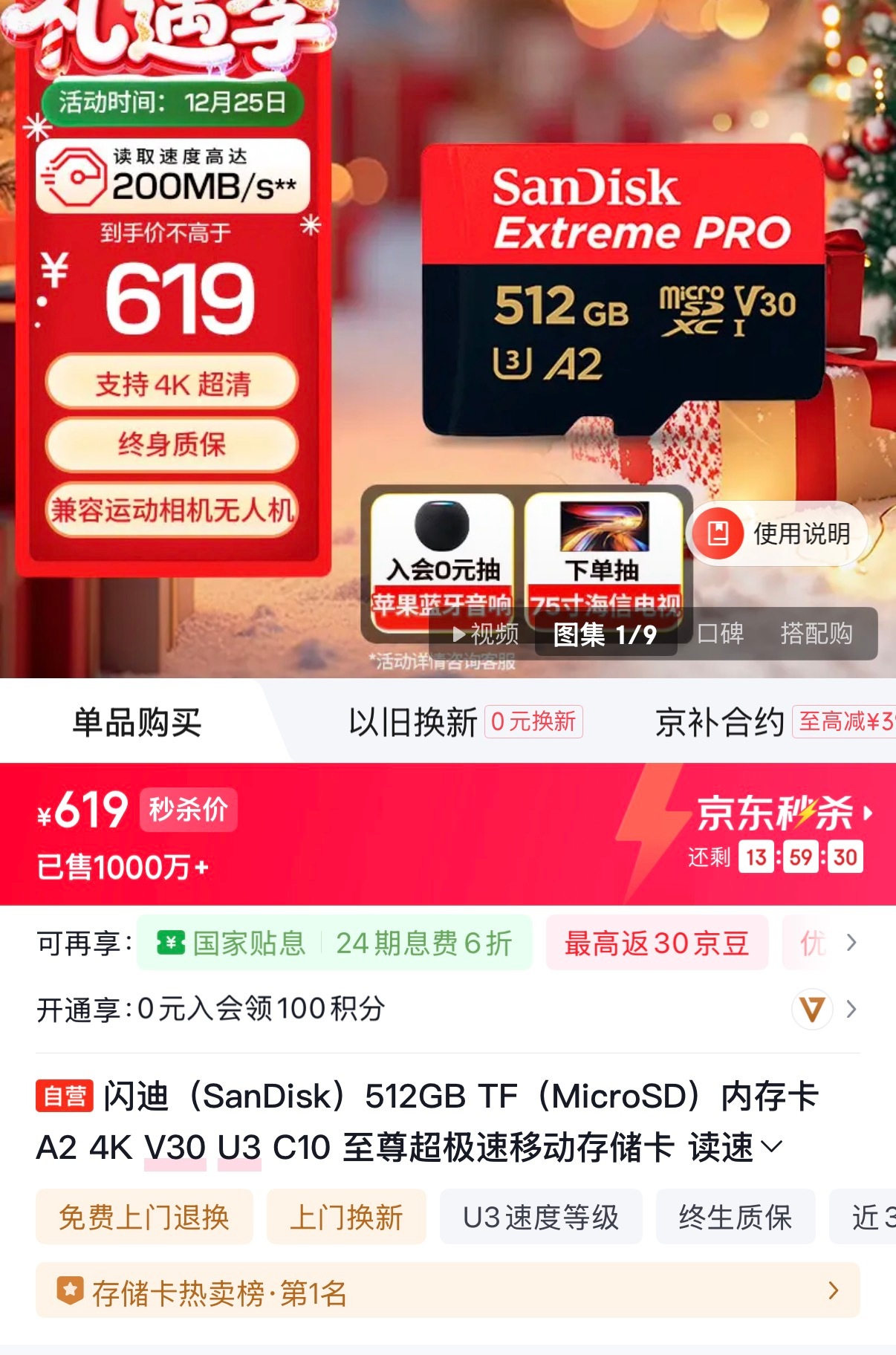今年 6 月初 355 块钱买的储存卡,现在已经涨到了 619 了,算下来涨了