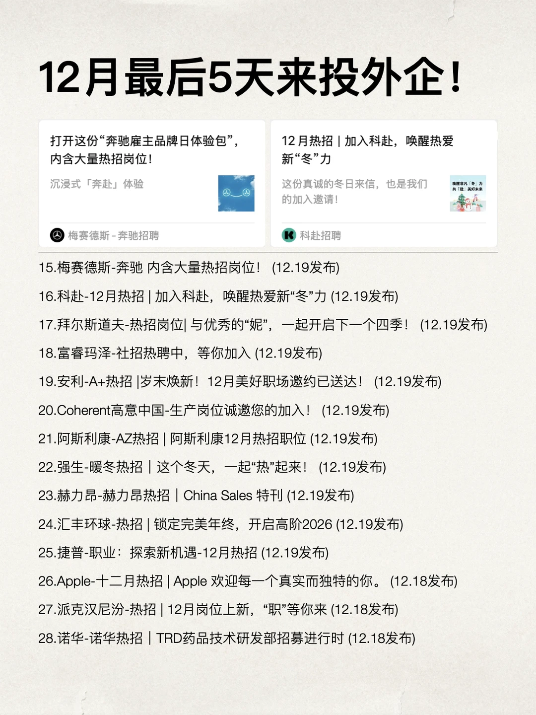 说实话,年底这波外企机会真的比很多人想象中多。这两周新开的 hc 一点都不少,很多团队都在赶年末补人、锁明年项目节奏,现在反而更愿意看简历、推进流程 . 外企年底投最大的优势就是:反馈快、流程短,不少岗位都是直接聊,节奏清清爽爽。 . 福利这块也比较稳定,常见就是 955 双休、年假 12–15 天起、补充医疗齐全,女性友好度高,请假、调休、假期制度都比较人性化,不太消耗人 . 如果有年后找工作打算的话,其实这5天真的很适合冲一波 . 坚持日更✊🏻,对外企感兴趣的欢迎常来看看 .