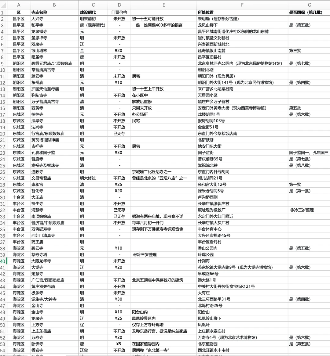 之前方便自己出门玩 出过一份北京寺庙地图 大概囊括了50个左右 最近两三个月我差不多走完了 然后又认真全面整理了北京的寺庙 大大小小寺庙加起来有200个 我本来想试着一张图展示处理 [笑哭R][笑哭R]可太难了 二环内太密集了 特别是什刹海周边 根本放不下 就先展示部分吧 先出了这张图,以六环内为主 二环我可能会单独出一期,这次遗漏了不少 [打卡R]其中标黄的,是我觉得还不错的 对于寺庙入门的朋友 可以先逛这些 我自己还差法海寺、白云观、北顶娘娘庙没去 其他差不多了 我觉得去过黄色的,就算入门了吧! (标了1.2.3……,是指国家第几批文保单位) [打卡R]标灰的,是未开放,想去也去不了的 [打卡R]剩下的,是作为第二梯队的,慢慢去,大部分都免费 [向右R]北海公园里其实也有不少寺庙,包括阐福寺、永安寺等,之前都没注意 [向右R]此外东岳庙、天宁寺、广济寺,应该还不错,我还没去 [向右R]柏林寺可惜不开 [向右R]还挺多寺庙没开的,做完图才发现还有些遗漏,比如海淀的大慧寺(也没开) [集美R]欢迎大家补充! 争取做一张北京寺庙分布图,大家照着打卡就行 PS. [打卡R]1.八大处还挺不错的,我是之前赏秋特意去了一趟(居然都不是国保[笑哭R]) [打卡R]2.北京五顶,我是这次整理才知道的,除了北顶娘娘庙,还有其他4个,可惜也就这个能看了 [打卡R]3.五坛八庙,也是这次了解的,觉得可以深入探索下 图上有概述 除了这些,还有哪些其他分类方式,方便我们新人更深刻的理解 [合十R]求大神们赐教! PS.图中,除了未开放的,有去过一半的嘛? 图1:是这次整理的地图 图2:是我还在补充完善的北京寺庙清单 图太小看不清,可以找我要原图