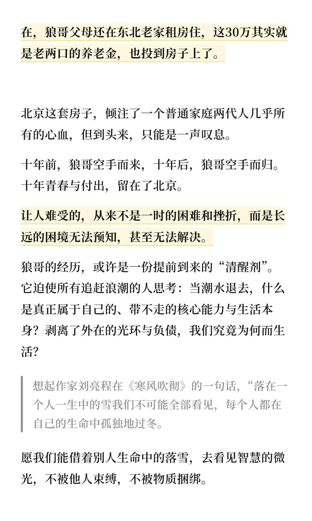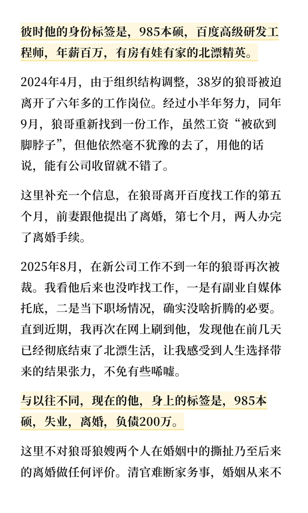 在北京买房、结婚、生子后,狼哥在百度工作六年,年薪百万,但组织结构调整被裁,负债200万。经历离婚后,他结束了北漂生活,反思人生选择与核心能力。