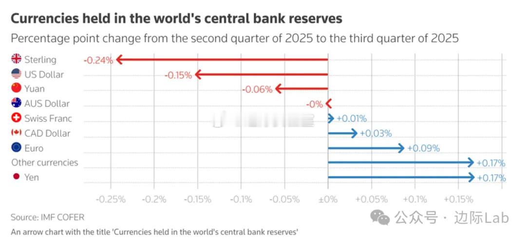 美元在全球官方外汇储备中的份额在三季度微降0.15个百分点至56.92%,延续了自2015年以来从超65%高位缓慢回落的结构性去化趋势。另外,英镑在储备中的占比也收缩0.24个百分点,而日元则录得0.17个百分点的增幅。来源:Reuters
