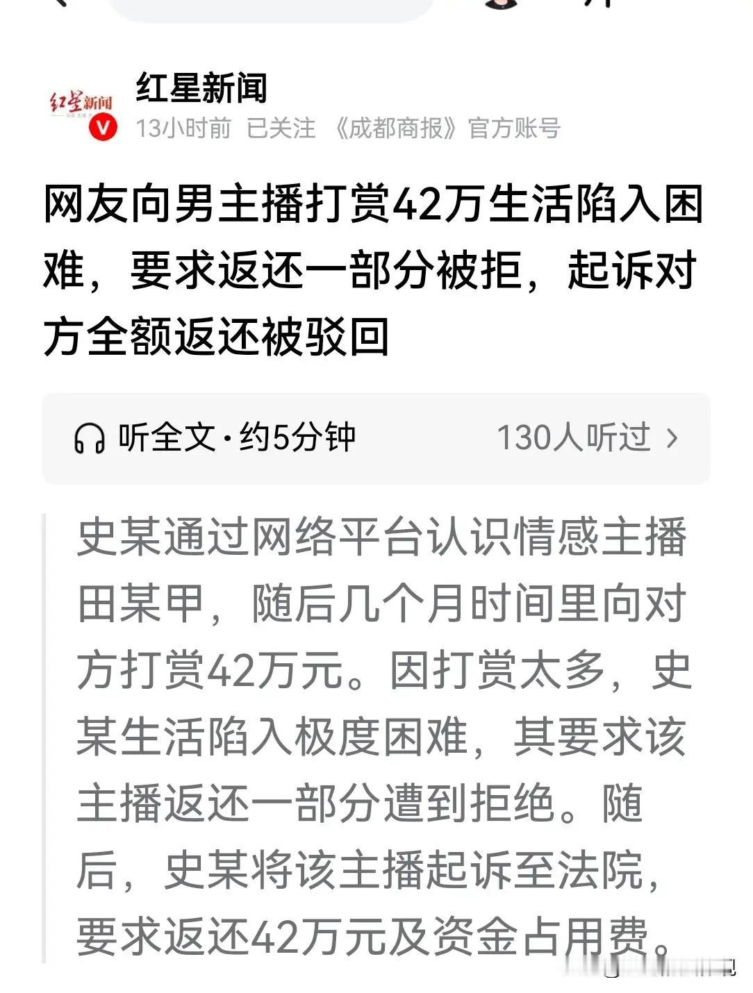 在山西太原的繁华街巷中,有一位善良而热情的女子,她叫李娜。她性格开朗,心怀感恩,总觉得人生应当“天道酬勤,厚德载物”。然而,生活的琐碎与压力让她逐渐迷失在虚拟的网络世界里。 一天,她在网上遇到了一位风趣幽默的男主播,名叫小杰。两人一见如故,仿佛“志同道合,心心相印”。为了表达心意,李娜不断给他打赏,仿佛“点石成金”,希望能带来好运。两人相互称呼“姐弟”,笑谈人生,似乎“山高水长,情谊长存”。然而,虚拟的温暖渐渐变成了“金钱的陷阱”。 半年不到,李娜竟为他打赏了42万余元,犹如“倾家荡产”,为了“虚拟的情谊”,她不惜“借债度日”。生活变得“杯弓蛇影”,吃饭都成了问题。她心中充满了疑问:这真的是“真情实感”吗?还是“金钱的魔咒”在作祟?她决定“拨云见日”,请求男主播返还部分资金,却被对方“冷漠拒绝”,犹如“天涯若比邻,心隔千山”。 愤怒与失望交织,她选择“怒发冲冠”,将男主播起诉,要求返还42万余元及资金占用费。法院判决,李娜的“善良”与“理智”得到了应有的“正义”。这件事告诉我们,“健康的心态”比任何财富都珍贵。真正的健康,既是“身心双调”,也是“内外兼修”。虚拟世界虽精彩,但“身心健康”才是“长久之计”。 人生如“行云流水”,不应为“虚幻泡影”所困。我们要学会“知足常乐”,用一颗感恩的心,珍惜眼前人,善待自己。记住,“健康是最大的财富”,只有“心宽体胖”,才能“福如东海,寿比南山”。愿每个人都能“心怀感恩,身心康泰”,在“阳光明媚”的日子里,迎接“美好的未来”。