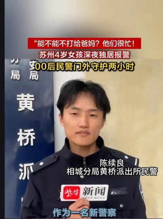 苏州这个冬夜,一个4岁小女孩的报警电话,听得人心里软软的!12月22日晚8点45分,黄桥派出所接到个奶声奶气的求助:“警察叔叔,我一个人在家,黑得怕……” 00后民警陈续良赶过去,见孩子穿着薄睡衣,光着脚站在门口,眼里含着泪却小声说:“别告诉爸爸妈妈,他们上班忙。”原来爸妈在苏州打工,爸爸出差、妈妈在医院值夜班,小家伙愣是憋到扛不住才报警。 陈续良没进门,就蹲在楼道里陪她聊天,从动画片讲到幼儿园的朋友。孩子渐渐放松,还把最喜欢的小熊玩偶递到门缝外“给叔叔抱”。这一守就是俩小时,他时不时从门缝瞅一眼,听见孩子说“想再试试睡觉”,才放轻了脚步。 夜里11点多,妈妈匆匆赶回来,看到民警还守在门口,眼圈一下子红了。后来孩子爸爸在外地哽咽着说:“她知道我们累,可越懂事越让人心疼。”陈续良说,这趟出警让他明白,警察有时守的不只是平安,更是孩子心里那点踏实。 懂事的娃遇上暖心的警察,成了寒冬里最攒劲的光。你小时候有过独自在家的害怕吗?评论区聊聊,转发让更多人看见这份温柔~