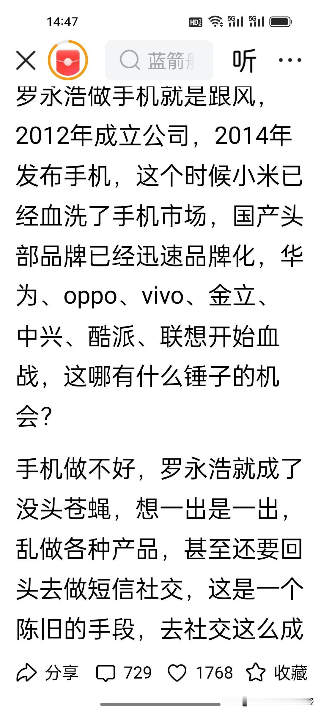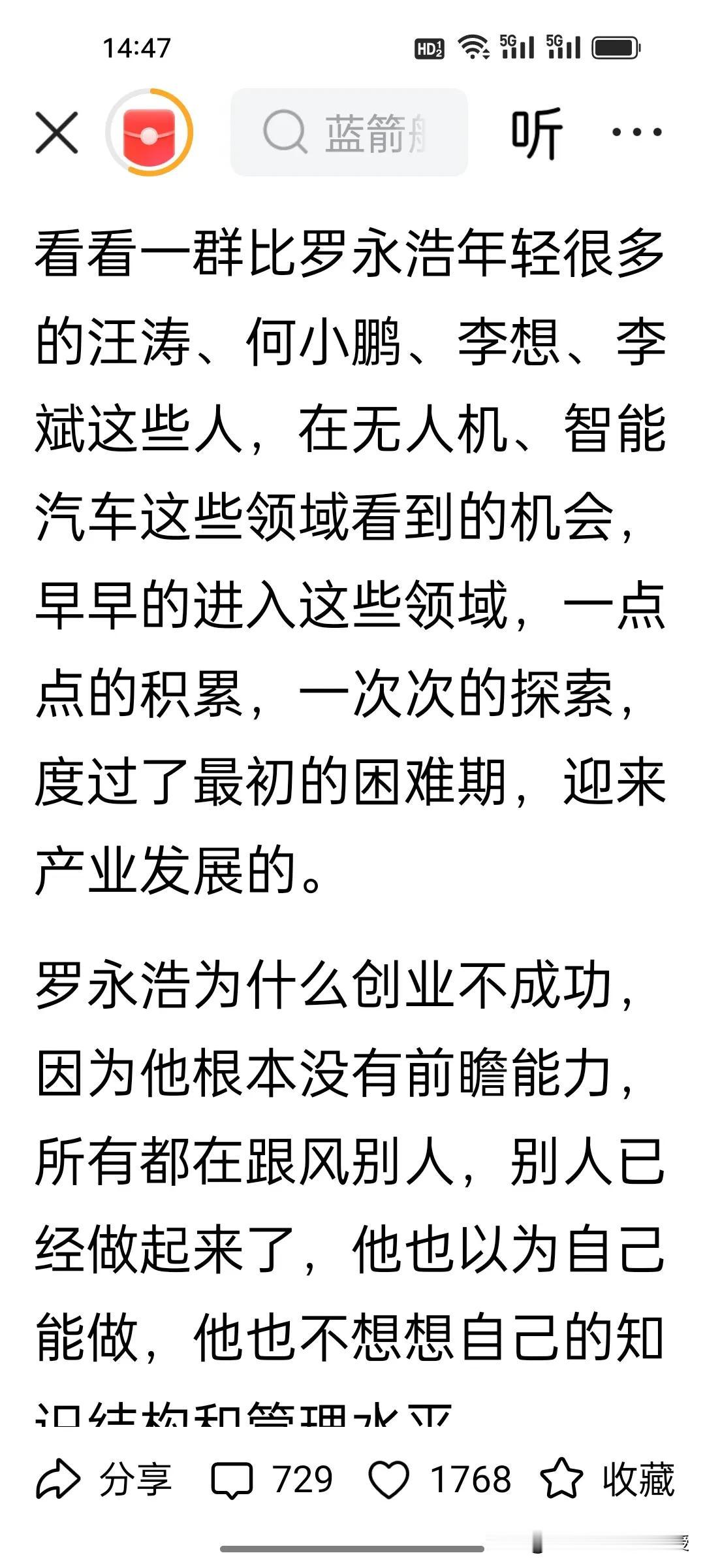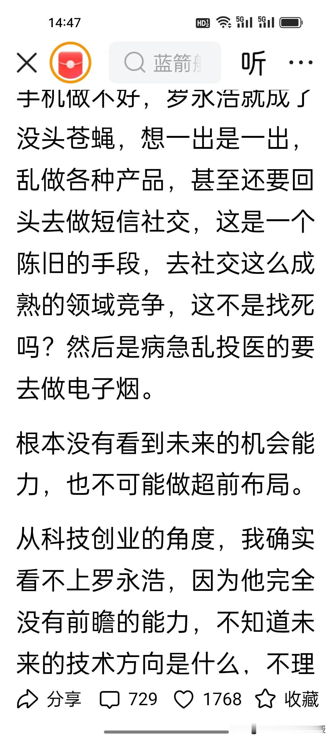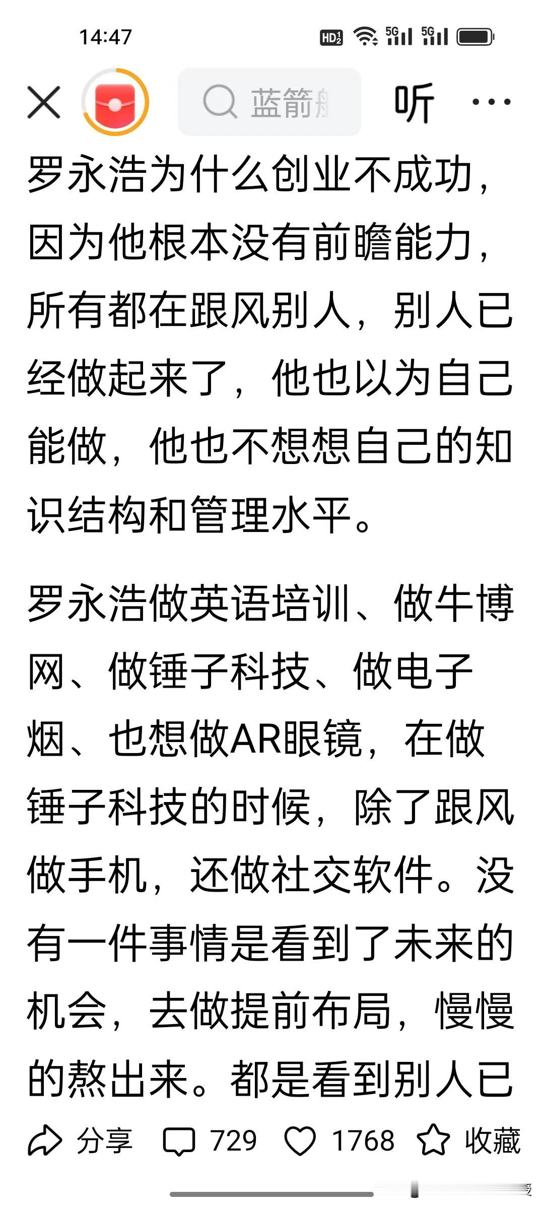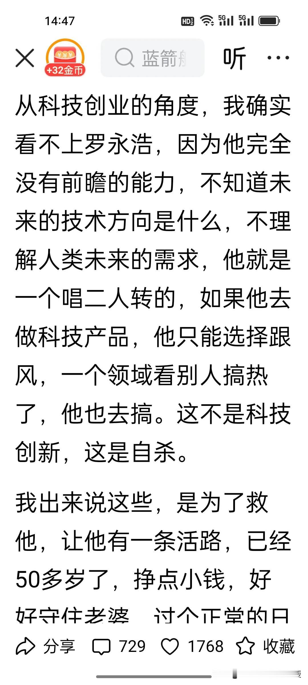 罗永浩这次真的踢到钢板了,项立刚连发4篇长文!毫不留情地分析了罗永浩的前半生,其创业失败三大硬伤被撕穿! 谁都想不到,项立刚与罗永浩从宽带骂战已经升级成创业复盘!项立刚《罗永浩创业为什么不成功(4)》火力拉满,深挖其前半生创业史,直指三大失败核心:缺前瞻性布局眼光、少技术积累、跟风做手机。 从锤子手机折戟到多次创业碰壁,项立刚字字戳痛点,这场争论早已不是单纯吵架,而是有理有据地直击罗永浩创业根基的深度剖析。罗永浩这次是真踢到钢板了,向来敢刚的他,会像回击西贝,华与华那样正面回击项立刚还是沉默应对?让我们拭目以待。