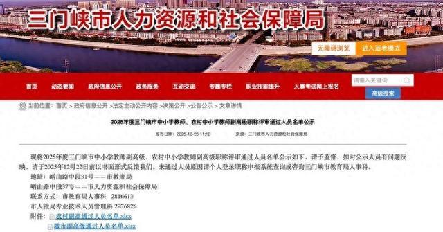 据网友所发布信息显示,2025年12月23日11点13分,三门峡市人力资源和社会保障局官网发布关于“2025年度三门峡市中小学教师、农村中小学教师副高级职称评审通过人员名单公示”。该公示中提及,“现将2025年度三门峡市中小学教师副高级,农村中小学教师副高级职称评审通过人员名单公示如下,请予监督,如对公示人员有问题反映,请于2025年12月22日前以书面形式反馈给我们”。公示信息中同时标注有该市教育局、人社局等单位地址与各局相关科室联系电话。“也就是说,上述公示发布时,监督日期已经结束,请问这样的公示意义何在,公众又如何进行监督。”上述网友如是发问。