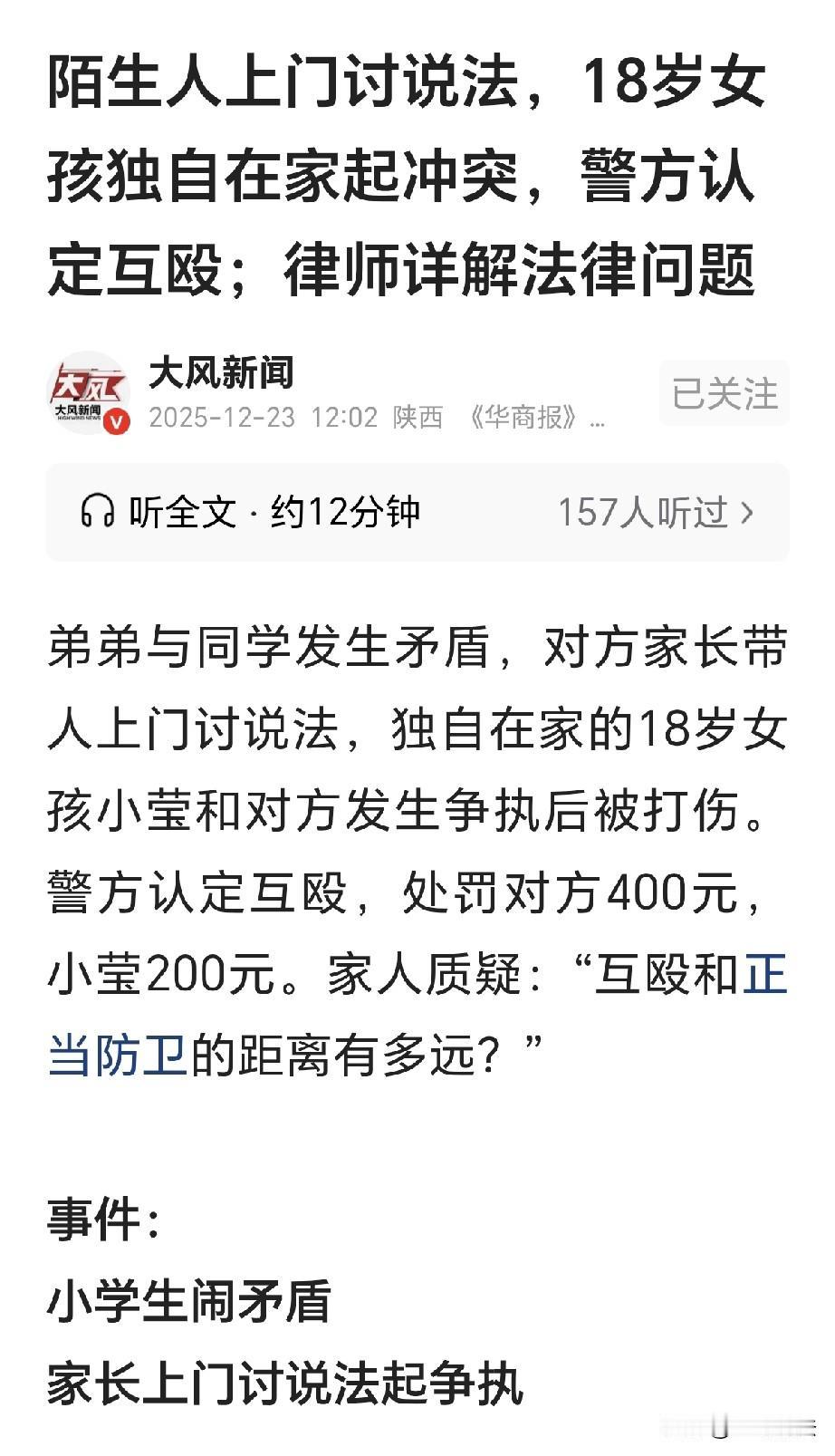 就不该开门! 山东东营,一18岁女子独自在家,听到有人敲门,开门后发现并不认识,来人说女子弟弟打了她家孩子,要求道歉,女子不想让她进门,让她去找学校,随后双方争吵,对方强行闯入,将女子按到餐桌下扇殴打,对方体格强壮,女子无力反抗,被打成轻微伤,女子报警,可对方一起来的人却作证,说女子先动手打人,结果被警方定为互殴,处罚对方400元,女子200元,女子不服,申请了复议,可家里没有监控,没有证据证明她没有动手,女子母亲认为,明明是对方非法闯入,女儿是正当防卫,可结果令她难以接受。 2025年2月26日晚上七点多,小莹独自在家休息。 她突然听到有人敲门,她立刻走到门前,打开门一看,一个体格健壮的女人站在自己家门口。 小莹不认识对方,可对方直接开口,说小莹的弟弟打了她家孩子,她来小莹家是要个说法,必须向她孩子道歉。 小莹懵圈,她不知道发生了什么,对方又是陌生人,她不由得心里害怕。 小莹不想让对方进自己的家门,要对方去学校找,谁知对方不愿意了,俩人言语不和,发生了争吵。 对方越说越急,强行闯进了小莹的家里,小莹不想让她进来,可对方人高马大,一把将她按倒在餐桌边的地上。 小莹还没反应过来,对方上来就是几个耳光,小莹单薄,根本就不是对方的对手。 她无力反抗,被打得耳朵嗡嗡作响,另一个跟着来的女人进门,一看情况不对,赶忙上前拉架,这才把对方从小莹身边拉走。 随后几个陌生人离开,小莹大哭,立刻打电话联系了自己的母亲。 母亲郭女士正在外地出差,她听到女儿被打,立刻就要女儿报警。 随后,小莹到医院诊治,这才发现她多处受伤。 诊断书上写着:脑外伤sj症反应、头皮血肿、身上多处挫伤,右边耳朵听力下降、一直耳鸣,达到了轻微伤。 原来,郭女士有两个孩子,小莹老大,今年18岁,还有个儿子,今年上五年级。 儿子平时和同小区的一个孩子在一起玩耍,那孩子姓陈,可春节的时候,两个孩子闹了别扭。 到了后来,俩孩子之间慢慢淡了,双方的家长并没有来往。 郭女士问过儿子,可儿子一直都说,他和陈某只是吵嘴,并没有打架。 郭女士理解不了,即便孩子们真有矛盾,家长可以向学校反映,也可以联系家长进行协商。 你们就这样直接上门,甚至动手打人,实在说不过去,让人根本无法接受。 7月份的时候,警方做出处理,小莹和对方被定为了互殴。 行政处罚决定书上大致写着: 对方家长张某某,因为孩子打架的事,带着自己的两个孩子到小莹家理论。 过程中与小莹发生争执,随后双方撕打在一起。 决定书里还提到,俩人在被旁人拉开之后,小莹又用手打了张某某脸部两下。 因此,警方认为张某某和小莹为互殴,张某某罚款400元,小莹罚款200元。 郭女士就不明白,明明是张某某闯进门打伤了女儿,怎么最后还成了互殴?难道说女儿被打,自己也要受罚? 郭女士认为,是对方非法侵入住宅,或是者寻衅滋事,而小莹独自在家,即便是和对方动手,也是正当防卫。 郭女士提起了行政复议,要求撤销对小莹的处罚,但是结果不尽人意,依旧被维持了原来的决定。 复议部门认为,根据张某某一方多人证言,是小莹先动手抓住了张某某的头发,并将其拽倒在室内地面。 没有证据证明是张某某先动的手,也没有证据证明张某某存在非法侵入住宅。 证人李某证实,在两人被分开后,小莹还打了张某某。 因此,小莹主张的正当防卫没有证据支持,处罚并无不当,依旧维持原处罚决定。 警方和复议机关大量采用了张某某一行人的说法,但是对小莹的说法提及很少。 张某某称,自己敲门,是小莹先扯她头发把她拽倒,并辱骂殴打她,她不记得是否拽了小莹头发。 证人李某说她把两人拉开后,小莹还打了张某某两下。 但郭女士认为,对方是一伙,他们之间互相印证,这能信吗? 那位邻居李某,她们不知道是谁,她说的是不是实话难以考证。 但是郭女士没装监控,没有证据,因此不能支持小莹的说法。 可是,别人闯进自己家里来打人,难道还不能还手吗?互殴和正当防卫的区别,又该如何认定? 《刑法》第20条规定:为了使本人或他人合法权益免受正在进行的不法侵害,采取制止不法侵害的行为,对不法侵害人造成损害的,属于正当防卫,不负刑事责任。 复议机关认定,小莹在被拉开后还打了对方,过了正在侵害的时间点,不算防卫。 而且没监控证明是对方先动手,反而是对方多人证词一致,因此,警方只能按互殴处罚。 《刑法》第245条规定:未经住宅主人同意,强行闯入他人住宅,或经要求退出仍拒绝,影响他人居住安宁的,构成非法侵入住宅罪。 小莹明确拒绝对方进门,对方强行闯入本符合认定标准,但因为没监控佐证,对方又不承认,复议机关才没认定。 郭女士如果不服,可以向法院提起诉讼。 对此,你怎么看? 关注@王哥说法 多学法律少吃亏