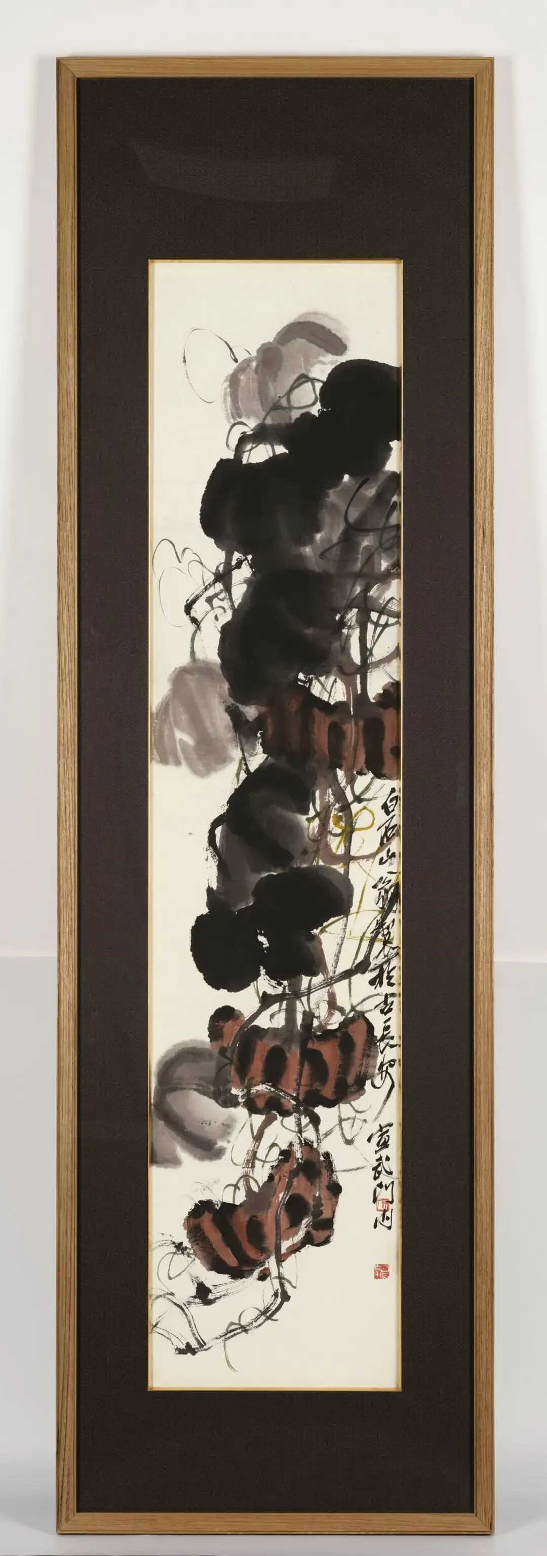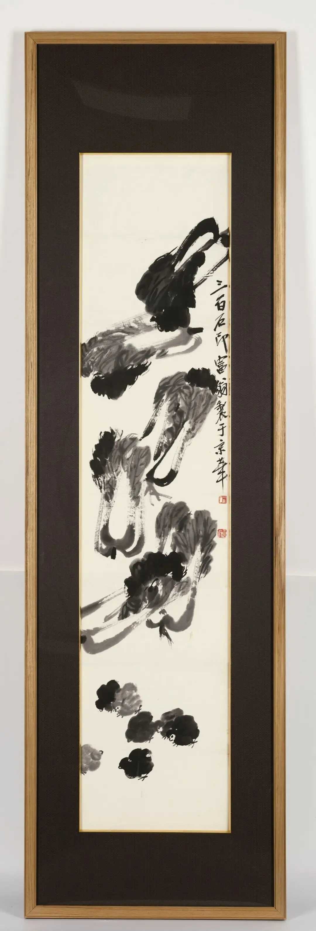 齐白石 《秋声秋物四屏》,镜心 设色纸本、水墨纸本 135×29.5 cm×4。分写“白菜雏鸡”、“墨叶金瓜”、“芭蕉夜雨”、“清塘群蟹”,所写俱为日常所见,亦为白石爱画之物。这就是中国风遇见艺术