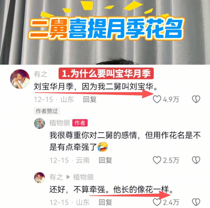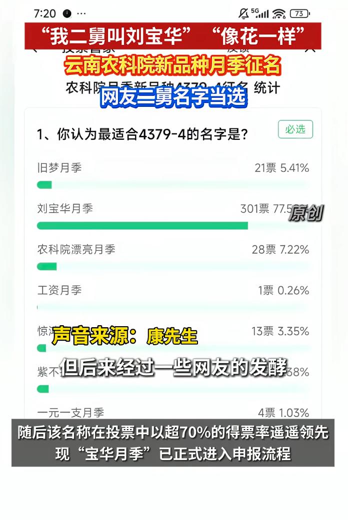 只要不干正经事儿,脑子都是好用的。 起因是农科院研究出来一种白色花瓣镶嵌粉紫色花瓣的新型月季,于是公开向网友征求花名。 一开始大家取名都很正常,直到一个很抽象的评论出现了,叫刘宝华月季,因为他二舅叫刘宝华。作者还很正经的回复了我尊重你对二舅的感情,但是用作花名是不是有点牵强了?网友说不牵强,他长得像花儿一样。然后作者将高赞评论发起了投票,最后刘宝华以压倒性优势胜利了。 最后,又有一位网友说:我的前夫姓刘,看着就烦,刘姓可以不要。直接叫“宝华月季”会不会更好听? 于是农科院也真的玩得起,直接将宝华月季给申报了。 官方也回应说:这个品类火了,感觉意料之外,但后来就是经过一些网友的一些发酵,加上“物华天宝”的一个联想,就让这种就玩笑性质的一种提议,就有实现的这种期待。我们又搞了一个直播,大家呼声最高的还是宝华,我们也想着就先试试看,如果这个宝华确实能符合那个林草局的命名法则,就行。 哈哈,官方也是很有趣啊。 其实看了一下投票的那些名字,最好听的其实就是宝华。 以后生物课本上关于宝华月季名称的由来,A, 色泽润如宝玉华光,B系统自动生成,C我的花一样的二舅。从此二舅也是在植物界有名了。 网友们辣评:玫瑰送爱人,康乃馨送长辈,宝华月季专送二舅。 还有网友给宝华月季编辑了百科:宝华月季,原名刘宝华月季,因外形酷似网友二舅得名,后因另一女网友前夫姓刘,为避其生厌,而改名宝华! 英文名称ANGEL(俺舅)。 另外,现在全网都好奇刘宝华到底长什么样?