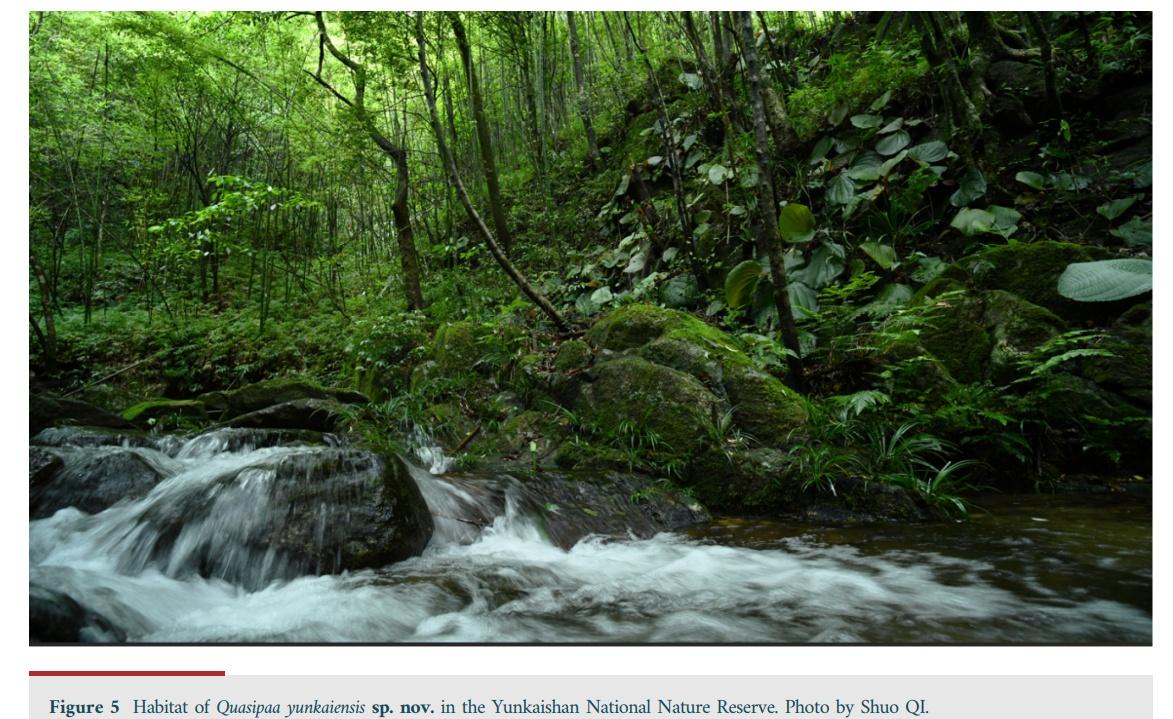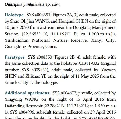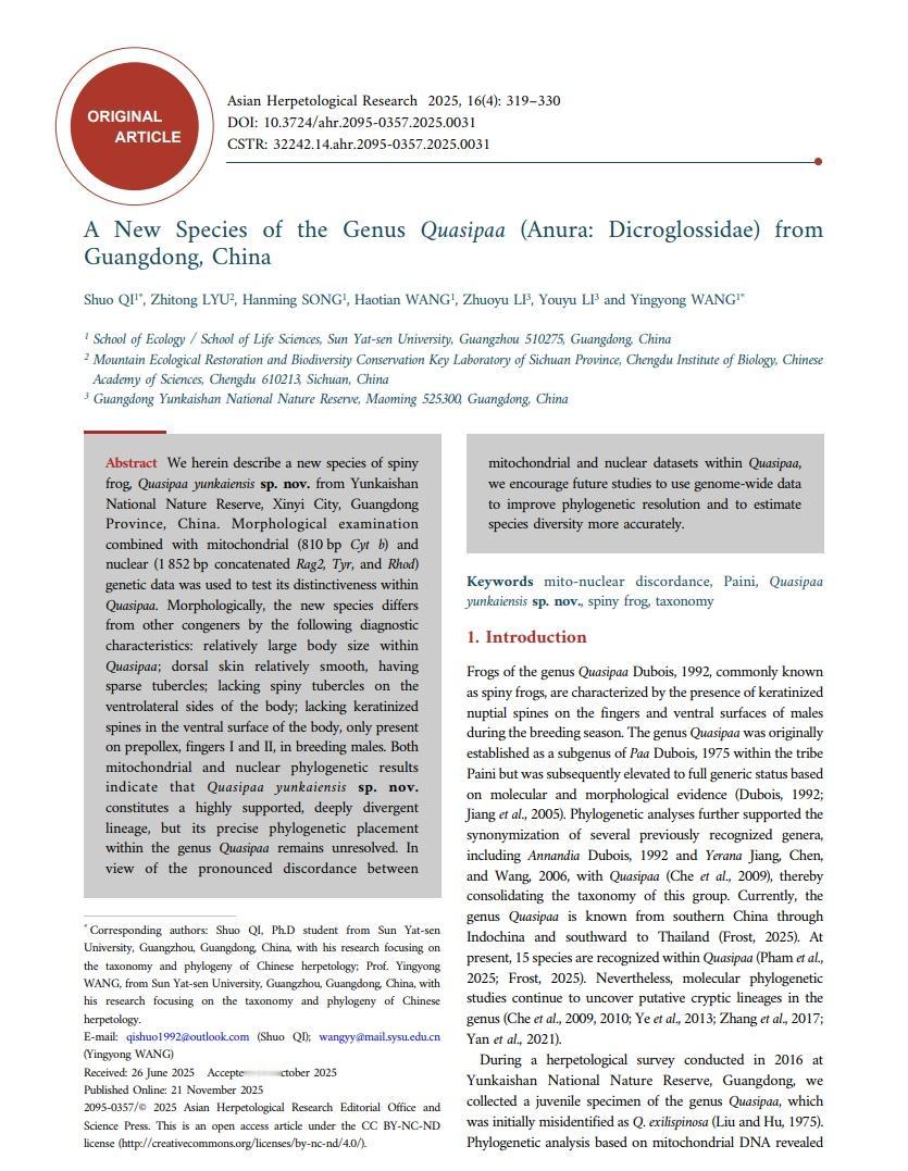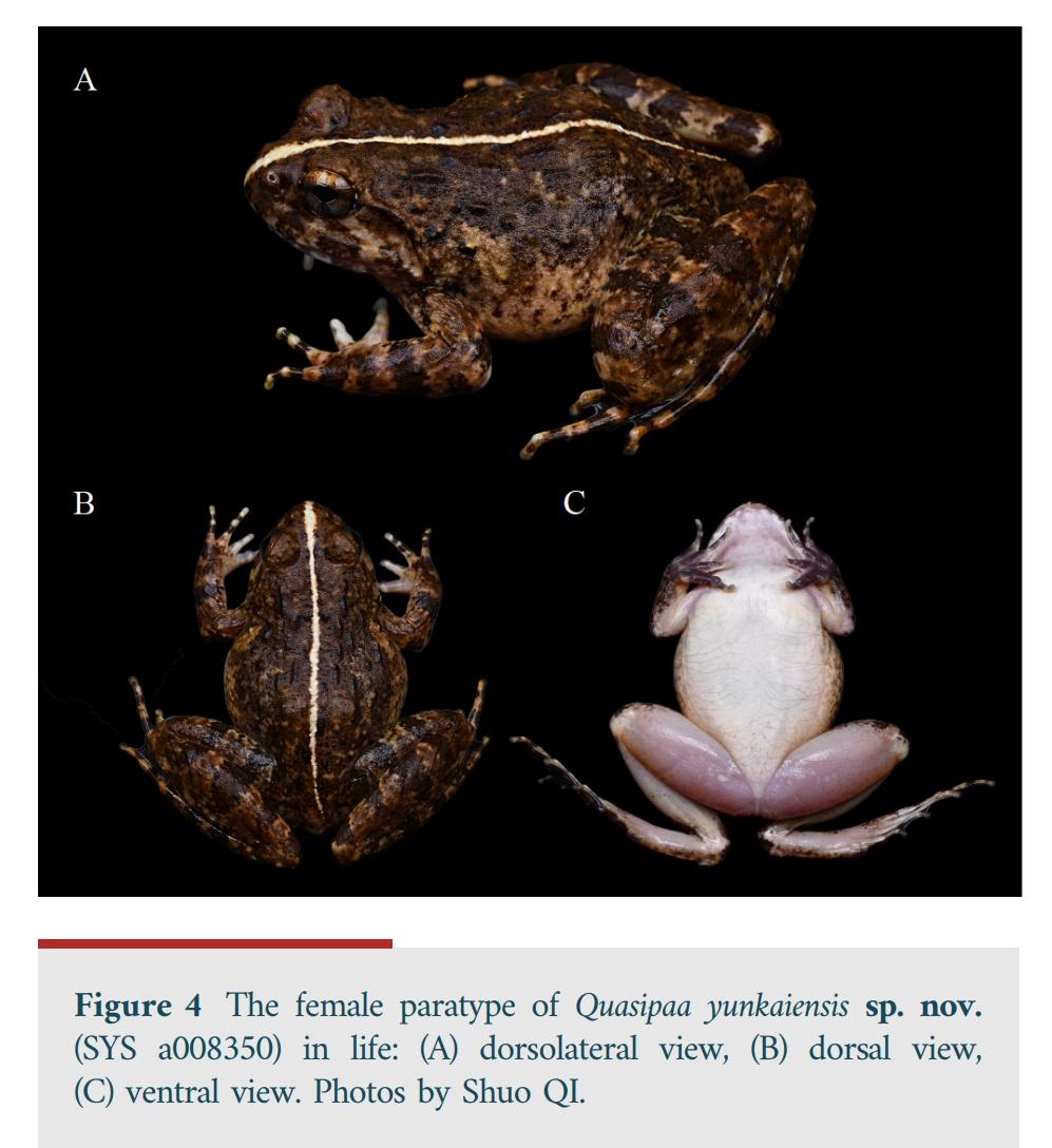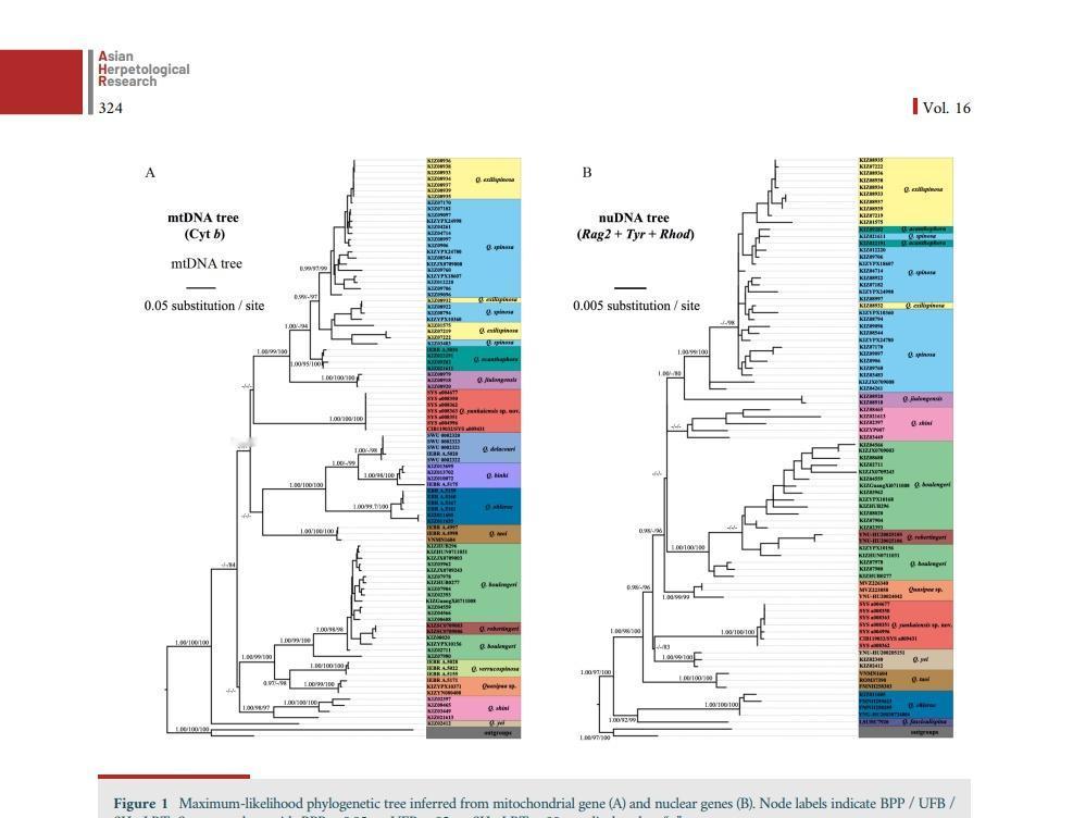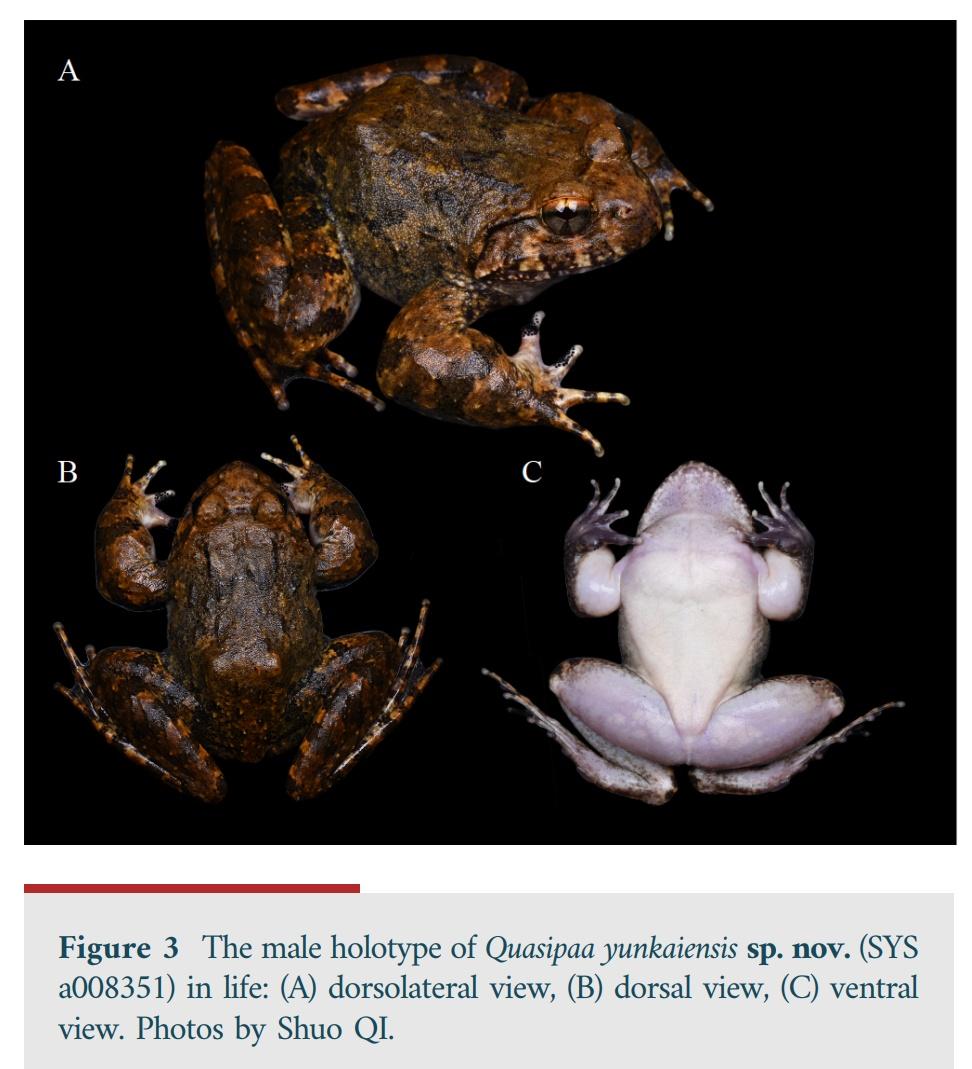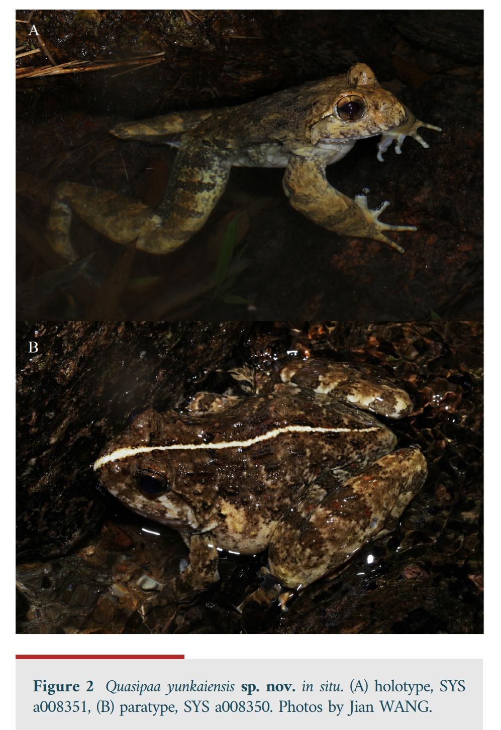 不出意外应该是2025最后一个新种,今年第8新, 来自云开山脉的特有种 Quasipaa yunkaiensis 云开棘蛙。棘胸蛙属普遍存在核质不一致的情况,为避免因依赖单一数据来源而产生的系统发育偏倚及物种界定误差,我们用线粒体和核基因片段分别构建系统发育树,结果均支持云开棘蛙是独立的遗传谱系。形态上云开棘蛙体型较大,繁殖期雄性仅1,2指具婚刺,胸腹面光滑无刺。目前该种仅知分布于广东西部的云开山脉,与小棘蛙同域分布。