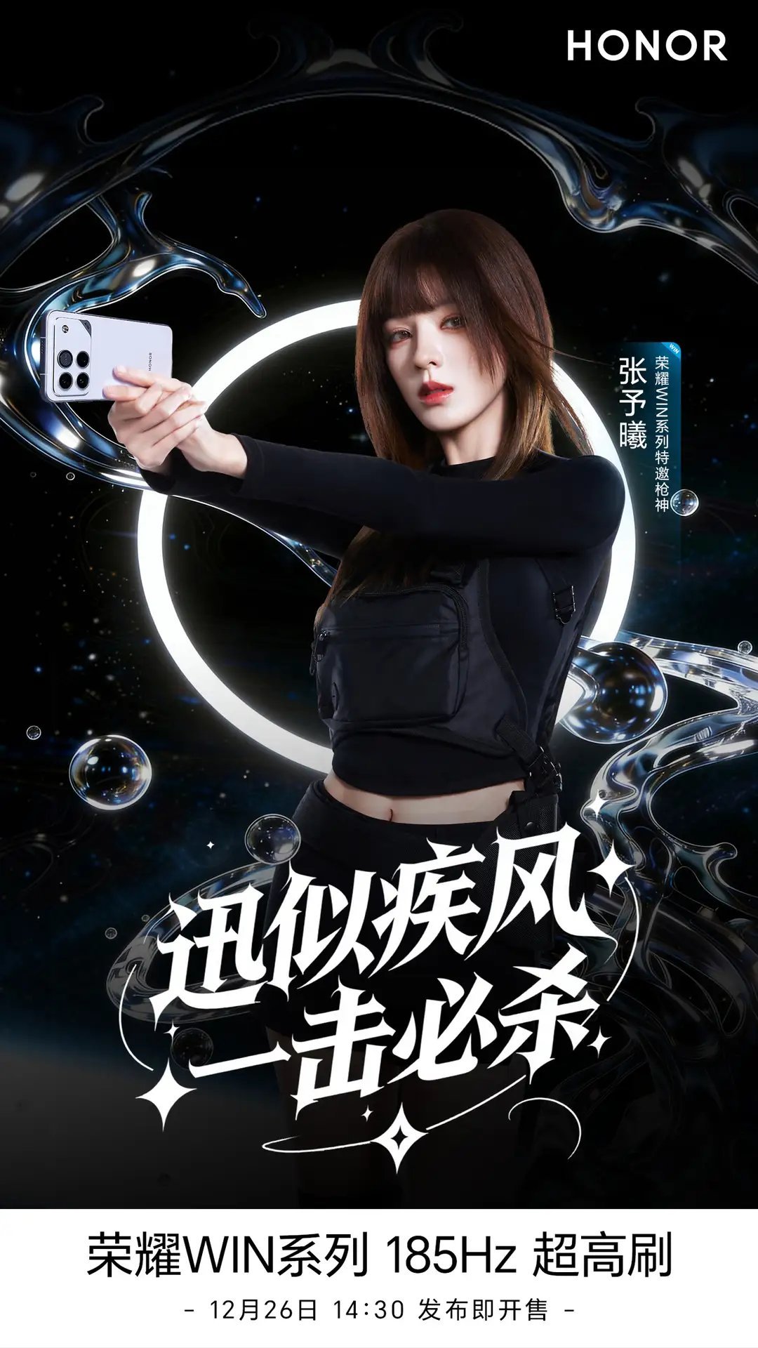 【荣耀WIN新机官宣全系支持185Hz超高刷游戏体验】荣耀手机官方宣布,WIN 系列新机全系支持 185Hz 超高刷游戏体验。这意味着新机将配备 185Hz 超高刷屏。值得一提的是,昨日有爆料称荣耀 WIN 系列要签约某新晋顶流游戏,结合官方今日与张予曦发布的共创微博来看,这款游戏有望为枪战类游戏。荣耀 WIN 系列新机已官宣将于 12 月 26 日发布即开售,“双杯”机型包括 WIN 和 WIN RT,并提供指定赢、快开黑、不怕蓝三款配色。整理系列新机已公布 / 曝光配置如下:荣耀 WIN RT配置参数:性能:骁龙 8 Elite 处理器屏幕:6.83"1.5K + 185Hz LTPS OLED 直屏 | 5920Hz PWM;电池:10000mAh 电池 | 100W设计:金属中框 | 内置风扇 | 3D 超声波指纹 | 双 1216 扬声器 | IP68/69/69K 防护 | 8.3mm 机身厚度影像:50Mp 大底主摄荣耀 WIN配置参数:性能:骁龙 8 Elite Gen5 处理器屏幕:6.83"1.5K + 185Hz LTPS OLED 直屏 | 5920Hz PWM电池:10000mAh 电池 | 100W 有线充电 + 80W 无线充电设计:金属中框 | 内置风扇 | 3D 超声波指纹 | 双 1216 扬声器 | IP68/69/69K 防护 | 8.3mm 机身厚度影像:50Mp 大底主摄 + 50Mp 3X 直立长焦