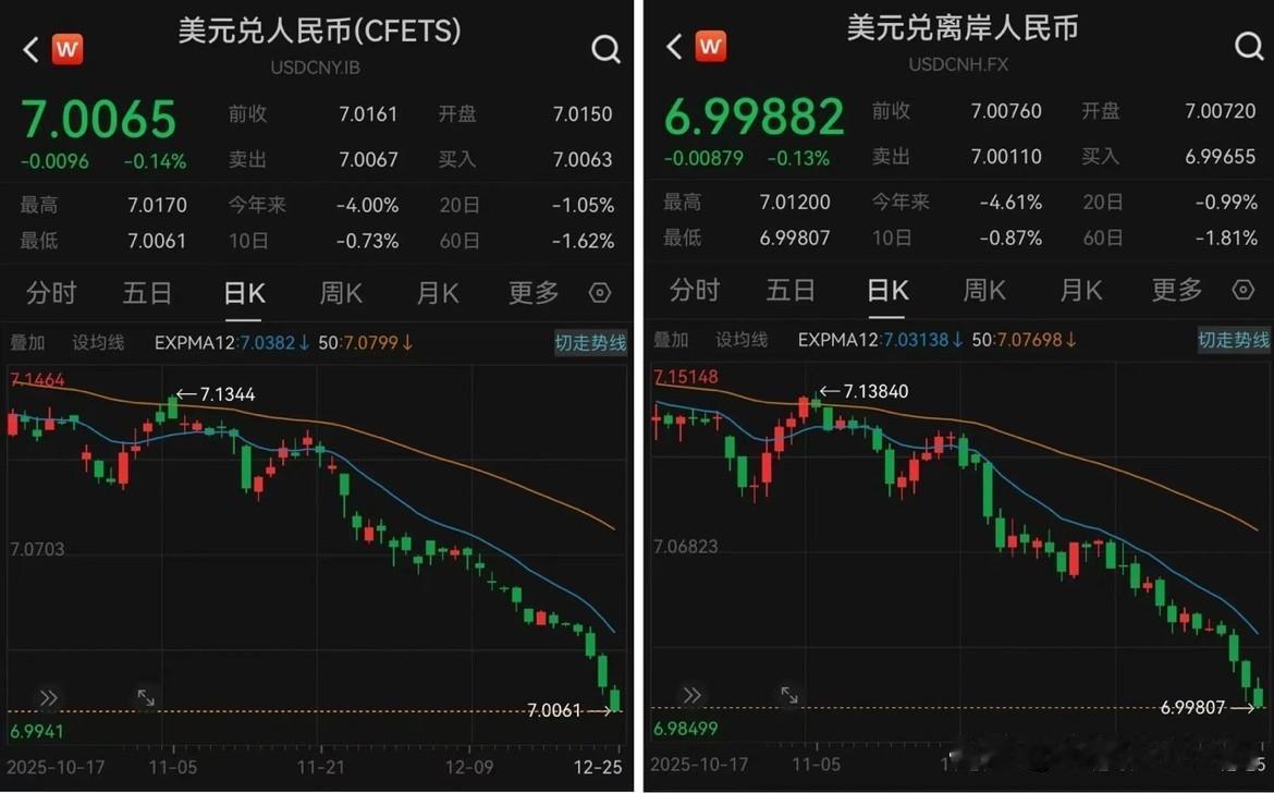 人民币涨!离岸人民币今天破7了。最高来到6.99882 这估计不是结束,而是开始。很多人都不清楚,人民币升值对我们好还是不好? 这要分开说,人民币升值,说明,人民币值钱了,以前以美元计价的东西,我们用人民币换算,就划算了。 但是一些用美元结算的出口企业,用美元结算完如果再换成人民币,这就要吃亏了。 未来,随着美元不断降息,非美元的货币都会升值,尤其人民币。 有说,人民币会到6.0,你信吗?