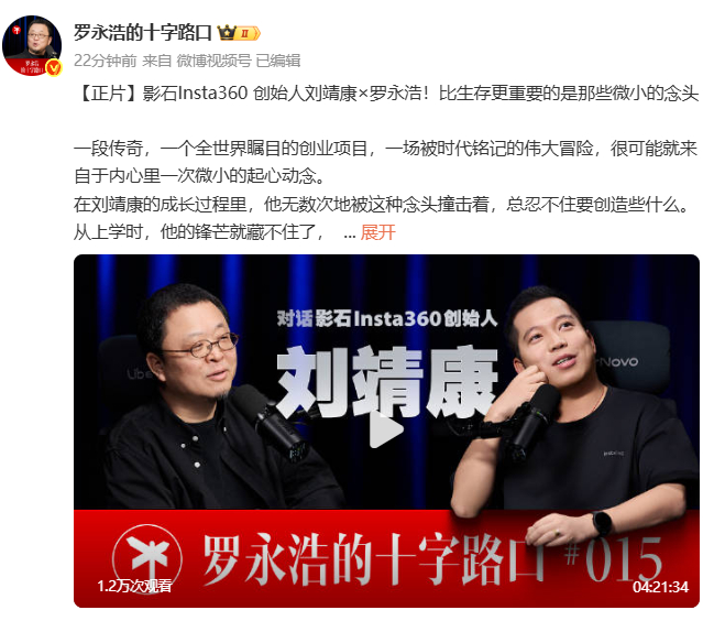 罗永浩对话影石CEO 最近影视被黑的挺惨,我是用过他家的go系列还有全景x系列的,产品很有意思且有很明显的方向性的,这次的访谈4个来小时,其实很能说明影石的调性。大家可以看看挺值得看,而且看完之后也能逐渐了解影石产品怎么来的,想法啥的。
