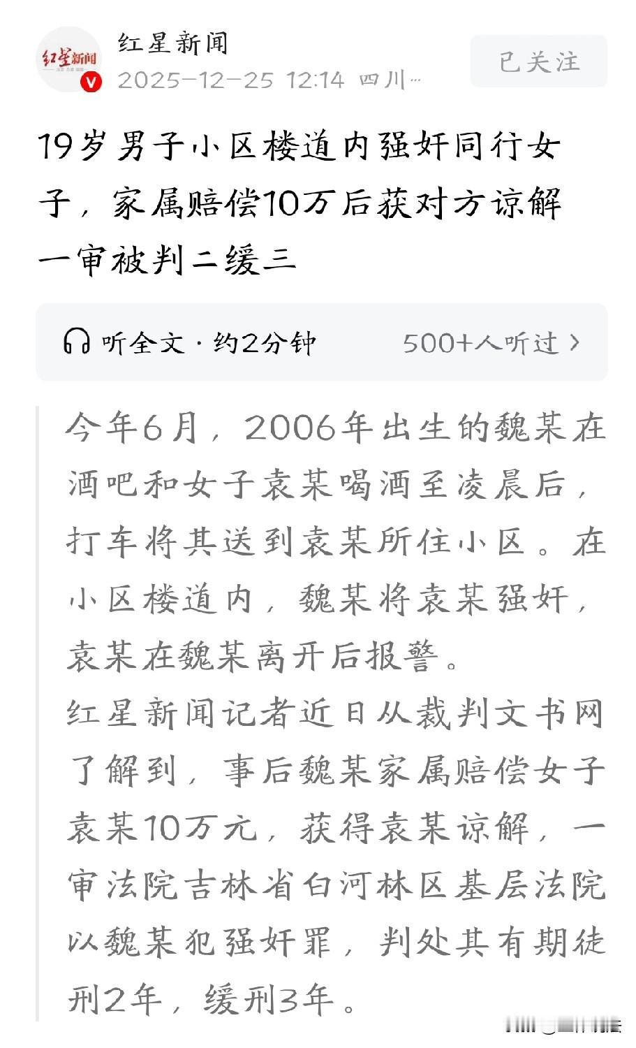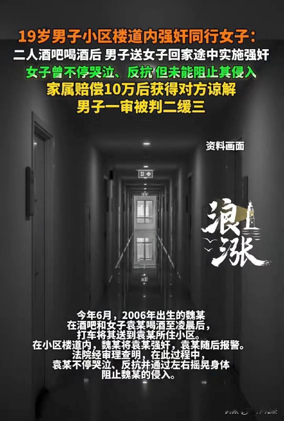吉林延边,19岁小伙凌晨三点在酒吧和一女子喝酒,喝完后,他主动送女子回家。走进女子家昏暗的楼道,小伙突然对这个漂亮火辣的女子产生了非分之想,一把将她按到墙角,不顾女子拼命反抗,强行将她侵犯。完事后,小伙匆匆逃离现场,女子立刻报警。小伙家属知道他闯了如此大祸,赶紧给了女子10万元赔偿,并获得了谅解。而接下来,法院的判决让人意外。 2006年出生的小伙魏某,才刚刚19岁,正处在青春躁动的年纪。 今年6月9日凌晨3点左右,魏某在酒吧里和年轻漂亮、打扮火辣的女子袁某一起喝酒。 酒局结束后,魏某热心主动提出,要送袁某回家,袁某看他挺真诚,没有多想便同意了。 两人坐上出租车,一路到了袁某所住的小区。 从出租车下来后,走进居民楼的楼道里,昏暗的灯光下,魏某看着眼前年轻漂亮的袁某,心里那股青春的躁动劲儿一下子就上来了,顿时就产生了非分之想。 他完全控制不住自己内心的邪念,趁袁某没注意,猛地一下把她压倒在墙角,开始不老实地动起手脚来。 袁某被这突如其来的状况吓得惊慌失措,她一边大声哭泣,一边拼命反抗。她用力地左右摇晃自己的身体,想要阻止魏某进一步的侵犯。 可魏某此时已经被欲望冲昏了头脑,根本不顾袁某的反抗,凭借着自己力气大的优势,强行对袁某实施了侵犯。 魏某得逞后,匆匆离开了现场。袁某遭受了这样的伤害,泪流满面,立马拨打了报警电话。 案发之后,魏某家属瞬间就懵了,他们从来没想过,19岁的儿子竟然能闯这么大的祸,但大错已经铸成,只能想尽办法去弥补。 于是,他们通过人民调解委员会,对袁某进行了10万元的赔偿,还一个劲儿地跟袁某道歉,希望能得到她的谅解。 也许是看到魏某家属诚恳的态度,又考虑到魏某年纪还小,袁某最终选择了谅解。 法庭上,法院经过仔细审理认为,被告人魏某违背了妇女袁某的意志,使用暴力手段,强行和袁某发生性行为,这种行为已经构成了强 奸罪。 《刑法》第236条规定:以暴力、胁迫或者其他手段强奸妇女的,处三年以上十年以下有期徒刑。 本案中,袁某面对魏某的侵犯,全程大声哭泣且拼命反抗,足以证明发生性行为完全违背其主观意愿。 而魏某趁袁某不注意将其压倒在墙角, 凭借自身力气大的优势无视袁某反抗强行与其发生关系,该行为属于法条中明确的“暴力手段”。 魏某的行为完全符合强奸罪的构成要件,按照法条基准刑,其本应被判处3年以上10年以下有期徒刑。 此外,依据《刑法》第67条:犯罪以后自动投案,如实供述自己的罪行的,是自首。对于自首的犯罪分子,可以从轻或者减轻处罚。其中,犯罪较轻的,可以免除处罚。 魏某并非被公安机关抓捕到案,而是在接到公安机关电话传唤后,主动前往公安机关投案。 而且,到案后如实供述了自己强行与袁某发生性行为的全部犯罪事实,完全满足“自动投案”和“如实供述罪行”这两个自首的必备条件。 按照法条规定,对其可以从轻或者减轻处罚。 再加上魏某案发后能够积极赔偿被害人袁某,还取得了袁某的谅解,所以法院酌定对他从轻处罚。 综上,法院以魏某犯强奸罪,判处其有期徒刑2年,缓刑3年。