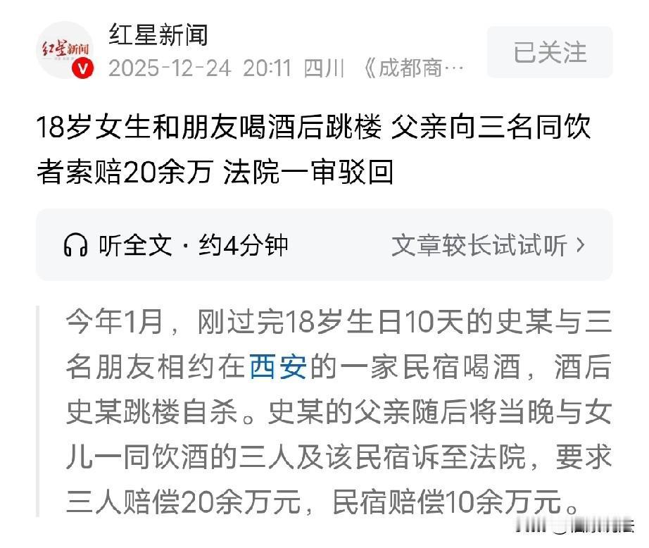 陕西西安,18岁女孩是私生女,刚过完生日第10天,因心情不好,约3个朋友在一民宿喝酒,一时想不开跳楼身亡,事后,女孩父亲向当晚和女儿喝酒的3个朋友索赔20余万、向民宿索赔10余万,法院一查发现,其父亲在事发前4、5个月才知道女儿还未成年就从延安到西安打工,是他对女儿关心不够,最终作出公正判决。 事情是这样的,2025年1月21号,史先生的女儿史某刚过完18岁生日的第10天,她心情不好便约了3名好朋友在一家民宿里喝酒。 这晚,史某和朋友们喝着酒,却一直闷闷不乐,年轻人的世界里或许有着不为人知的烦恼和心事。 可谁也没想到,史某喝完酒后,做了一个令人痛心疾首的决定,花一样儿的生命从此凋落。 1月22号早上8点多,有人发现了坠楼身亡的史某时,一切都已经无法挽回了。 史某的父亲史先生得知女儿突然离世的噩耗后,整个人悲痛欲绝,他想不通女儿为什么会走上一条这样的绝路? 处理完女儿的后事后,史先生觉得就是事发当晚和女儿喝酒的那3个朋友没有好好的照顾她,才导致女儿出了事,而民宿作为经营场所,也没有尽到安全保障义务。 在愤怒和悲痛的交织下,史先生一纸诉状将女儿的3个朋友吕某、陈某、李某以及民宿告上法院,向3个朋友索赔207980.9元,向民宿索赔103990.45元。 自从女儿去世后,史先生认为责任都在那3个朋友和民宿身上,所以要求他们承担责任。 但是,作为被告之一的李某却认为自己不该承担赔偿责任。 李某说:事发那天,是史某主动给我发的消息,说她心情不好,让我来陪她喝酒。喝酒的时候我们之间也没发生任何冲突。 而且,中途我想离开,她还挽留我,还拿出了她心情不好的证据。我要是知道她有跳楼的想法,打死我都不会离开房间啊! 所以,李某觉得史先生提出的赔偿请求,他无法答应。 而民宿的经营者也据理力争:警方已经对史某的死亡原因给了意见,说她是自 杀身亡的。 我们民宿并不是没有尽到安全保障义务,另外,史某已经是完全民事行为能力人了,她做什么都得自己承担后果。 我们作为经营者,已经做到了应尽的安全保障义务,所以,不该承担赔偿责任。 那么,三方都各执一词,法院会怎么判定呢? 法院经过仔细调查后,认定了以下事实: 事发当晚,女子史某刚满18岁10天。 而且,法院还查出一个重要的事实,史某竟是史先生的非婚生女,也就是私生女儿。 而史先生对于这个女儿史某一直疏于关心,法院查明,史某还没有到18岁的时候就从延安离开跑到西安打工了。而史先生作为父亲对此一无所知,直到事发前4、5个月才知道女儿出来打工的事。 法院还认为,史某还未成年就出来打工,父亲都不知道,这说明什么?说明史先生对女儿的关心远远不够,也许他是工作忙或者别的原因,但是,他作为父亲在女儿心情不好,负面情绪多的时候,没有给她家的温暖和父爱的关怀,最终,导致了女儿发生了悲剧。 那么,史先生认为女儿的3个朋友未尽的照顾义务,法院会怎么认定呢? 《民法典》第1165条规定:行为人因过错侵害他人民事权益造成损害的,应当承担侵权责任。依照法律规定推定行为人有过错,其不能证明自己没有过错的,应当承担侵权责任。 在共同饮酒场景中,共同饮酒者之间一般并不负有法定救助义务。要认定共同饮酒者承担侵权责任,关键在于其是否存在过错行为,且该过错行为与损害结果之间存在因果关系。 一般情况下,朋友一起喝酒并不负有法定救助义务,如果认为同饮者要承担侵权责任,重点在于其是不是存在过错行为,而且,他的过错需和损害结果之间有因果关系。 在本案中,是史某约3个朋友一起喝酒,但没有证据表明3个朋友对史某劝酒,也没有证据证明史某当时是喝醉的状态。 所以,法院认为3个朋友没有过错,和史某的死亡不存在因果关系,因此,他们不用承担责任。 至于,民宿方面是否要承担责任呢? 法院查明,民宿事发现场的窗户在房间的厨房位置,而且,要爬橱柜台面才能上窗台。 另外,民宿的房屋结构、装修、安全栏杆都符合居住标准。 所以,民宿尽到了安全保障义务。 不过,史某是用她朋友身份住进民宿的,但法院认为民宿对入住人员登记信息没有审查到位,这个情况需由相关部门对此进行处罚。 但这事和史某跳楼不存在因果关系,因此,民宿也不用承担责任。 另外,史某年满18岁了,她应该知道跳楼后会有多严重后果,但其父亲史先生以朋友未尽到照顾义务,以民宿未尽到安全保障义务为由让其承担责任,显然过于苛责。 最终,法院判决:驳回史先生的全部诉求。 事情让人唏嘘,18岁的女孩心思重,史先生作为父亲如果能多联系她,多关心一下女儿的心理,及时疏导一下,也许悲剧就不会发生了!