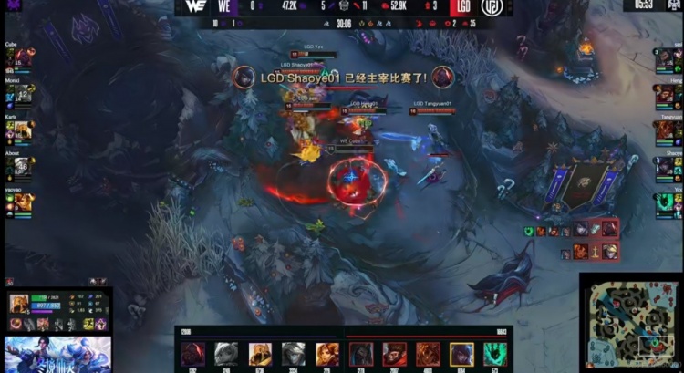 [21:02]河道团WE想反开但是正面被Ycx锤石一个灯笼再次拉扯了啊!侧翼Shaoye厄斐琉斯一个大招AOE三个,处理掉Cube塞恩之后多个人的LGD顺势拿下厄塔汗!2K多的经济差!