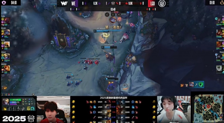 [3:49]下路对线WE打出优势,Monki波比gank到位,一个壁咚配合队友击杀掉了Ycx锤石,拿到一血!回头WE下路组草丛埋伏,又逮捕了想卡线的Ycx锤石!二连死!