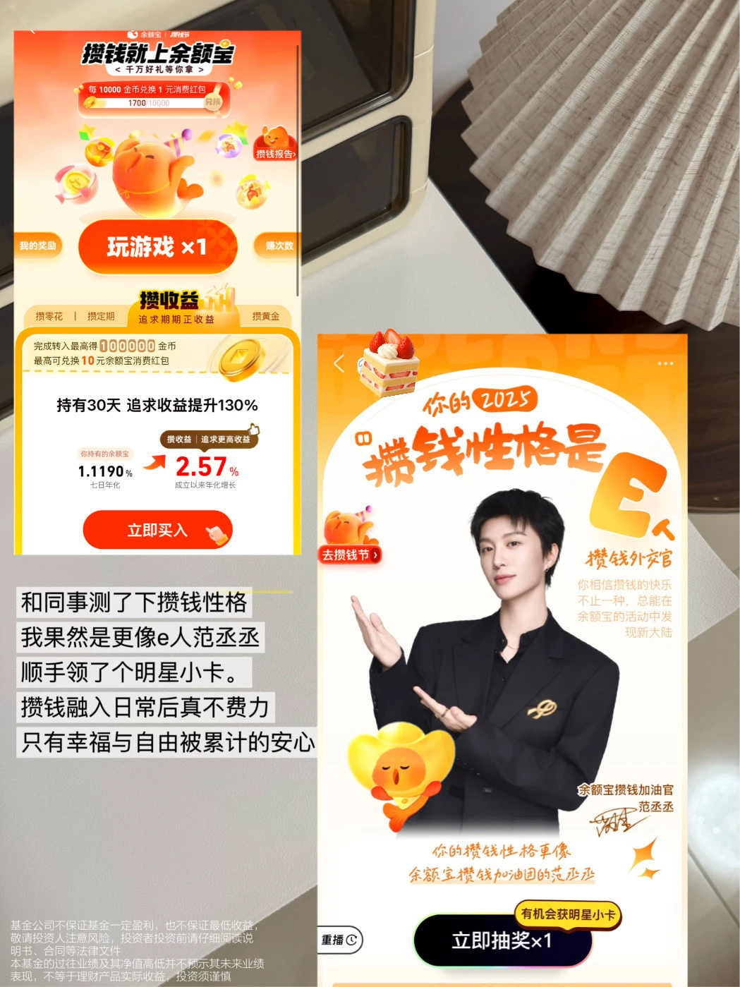 直接支付宝搜:余额宝攒钱 就能看到,现在还有攒钱节活动,中午候会时,和同事测了下自己的攒钱性格,我果然是更像e人范丞丞!顺手领了个明星小卡。攒钱这件事,融入日常后真的不费力,只有自由被累计的安心。(理财有风险,投资需谨慎)